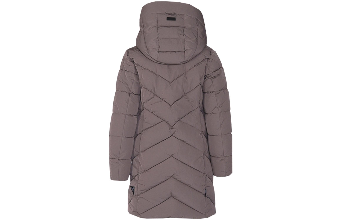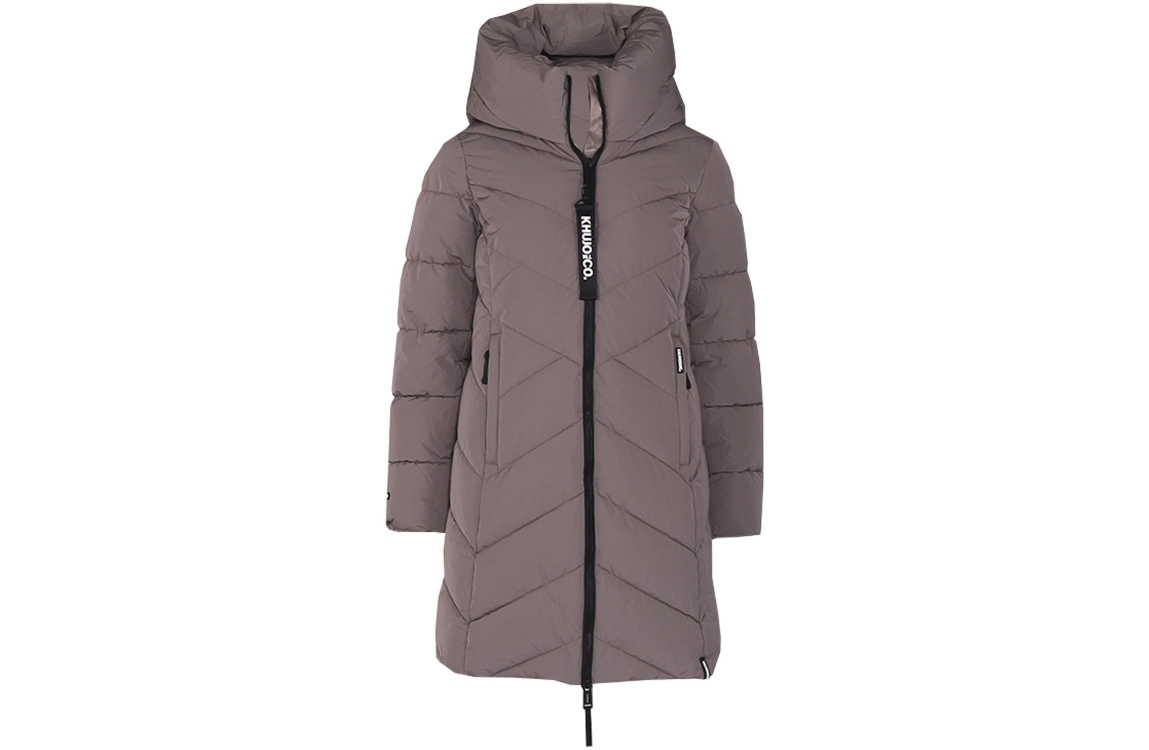 Khujo jas Dakar 1256CO253. Dit rechtvallend model is voorzien van een capuchon met trekkoorden en heeft lange mouwen met elastische manchetten. Deze beige/grijze gewatteerde jas van Khujo sluit door middel van een dubbele rits en beschikt over twee ritszakken.