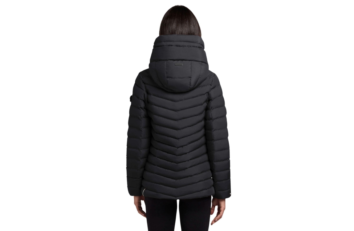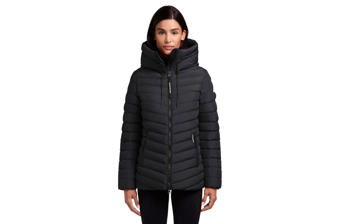 Khujo jas Pace 1263JK253. Dit aangesloten model is voorzien van een capuchon met trekkoorden en heeft lange mouwen met elastische manchetten. Deze zwarte gewatteerde jas van Khujo sluit door middel van een dubbele rits en beschikt over twee ritszakken.