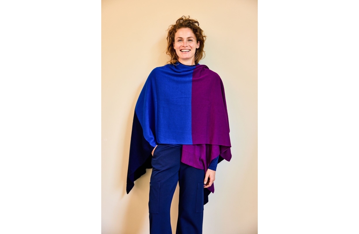 Kyra poncho. Dit openvallend model is voorzien van een ronde hals en heeft halflange mouwen. Deze paarse poncho van Kyra is bewerkt met een colorblock in de kleur blauw.