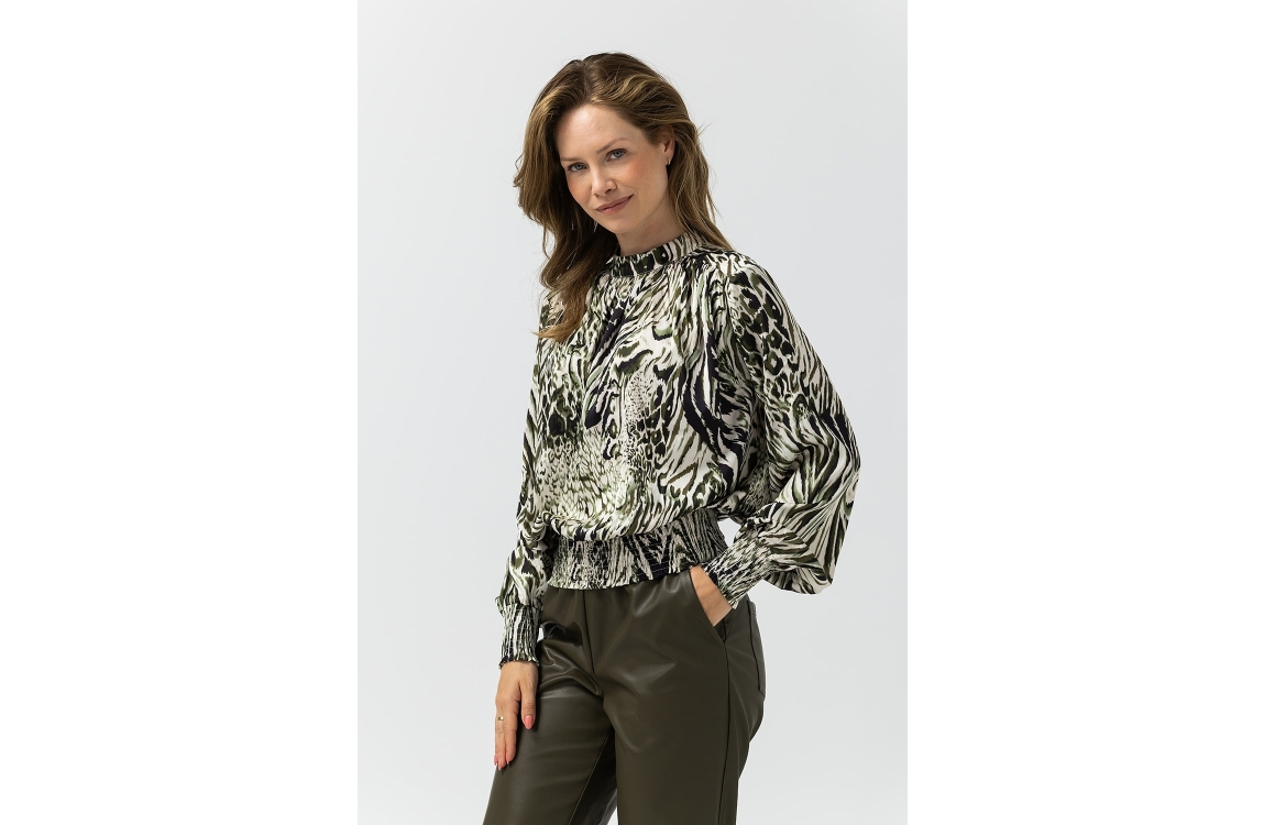 Label Dot blouse Abby 2521004. Dit rechtvallend model is voorzien van een ronde hals en heeft lange mouwen. Deze groen/witte/bruine blouse van Label Dot is bewerkt met een print en is afgewerkt met elastische boorden. Dit model sluit door middel van knoopjes aan de achterzijde.