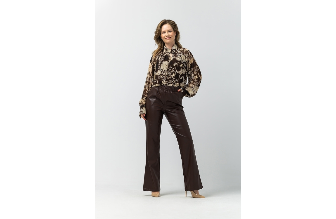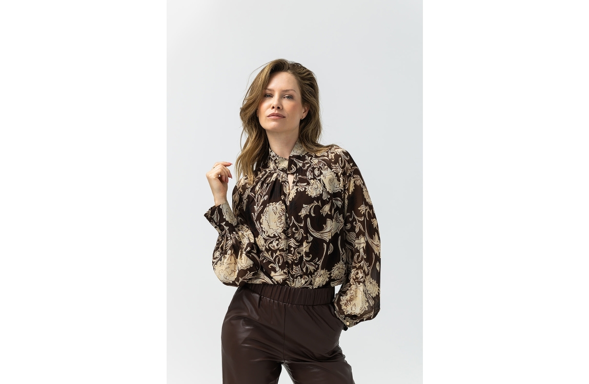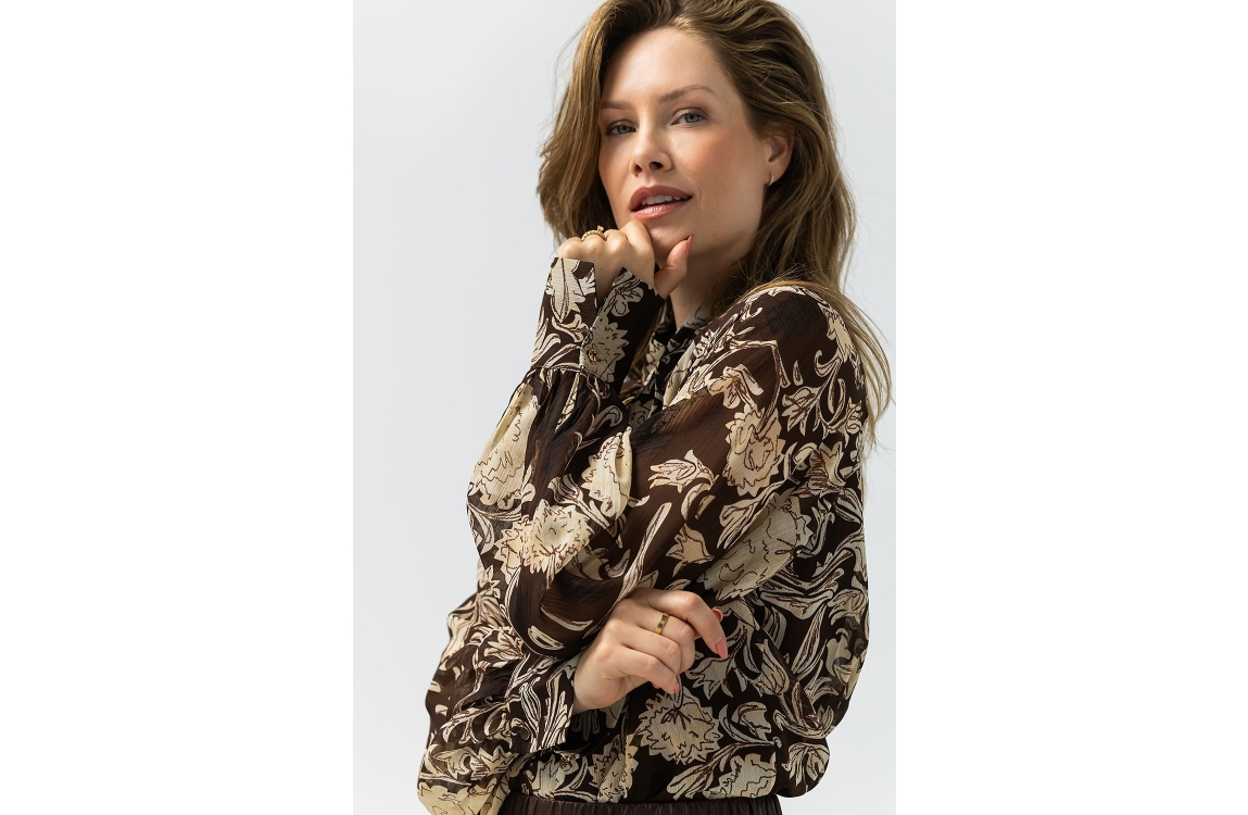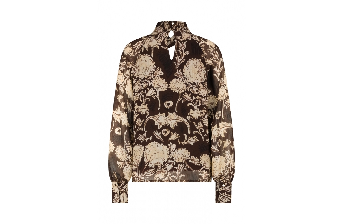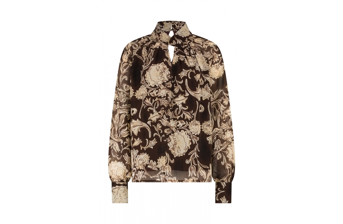 Label Dot blouse 2521005. Dit rechtvallend model is voorzien van een hoge ronde hals afgewerkt met een open detail aan de voorzijde en heeft lange mouwen. Deze bruine blouse van Label Dot is bewerkt met een beige bloemenprint en sluit aan de achter- bovenzijde door middel van een knoopje. Dit model beschikt over een voering.