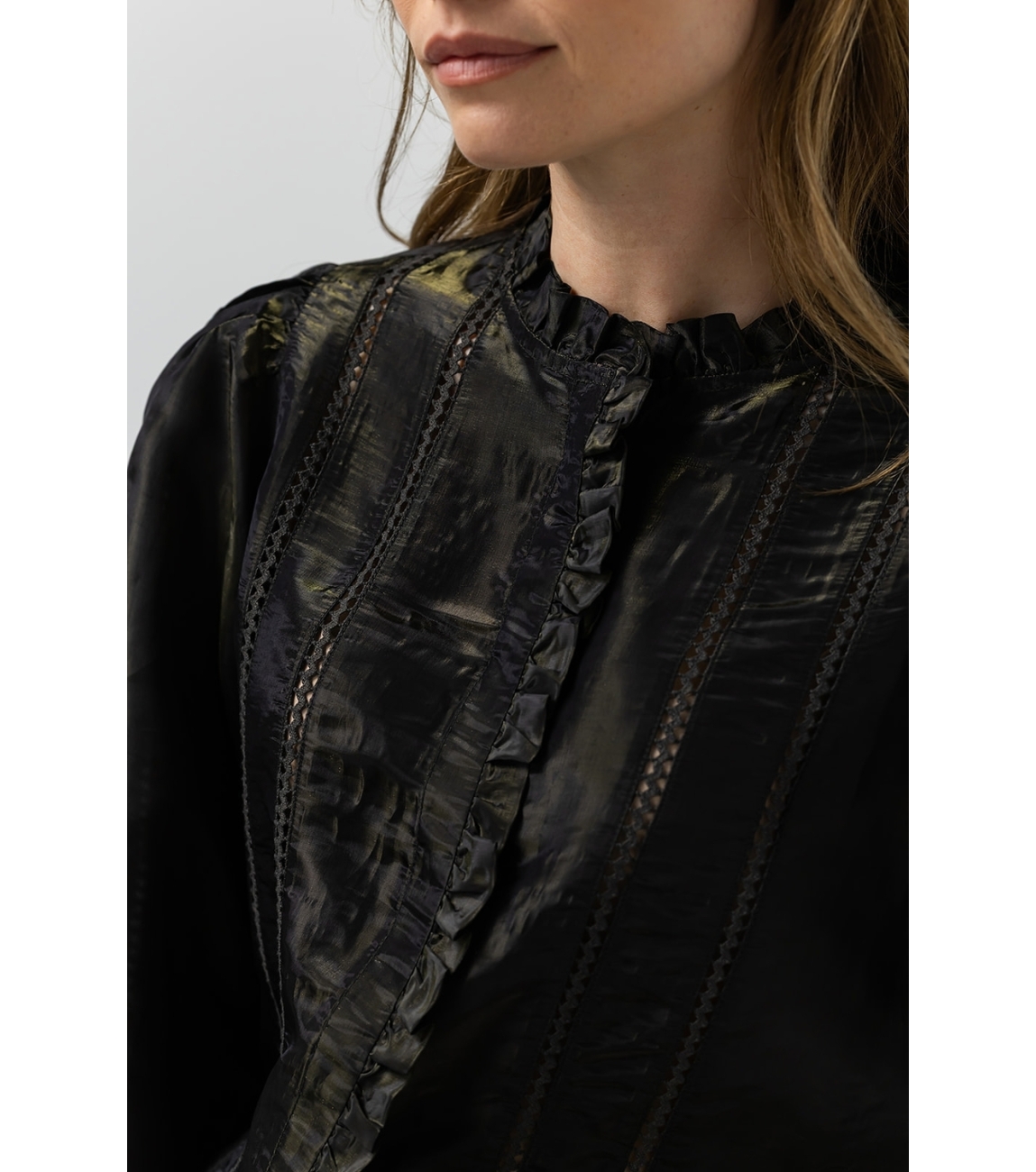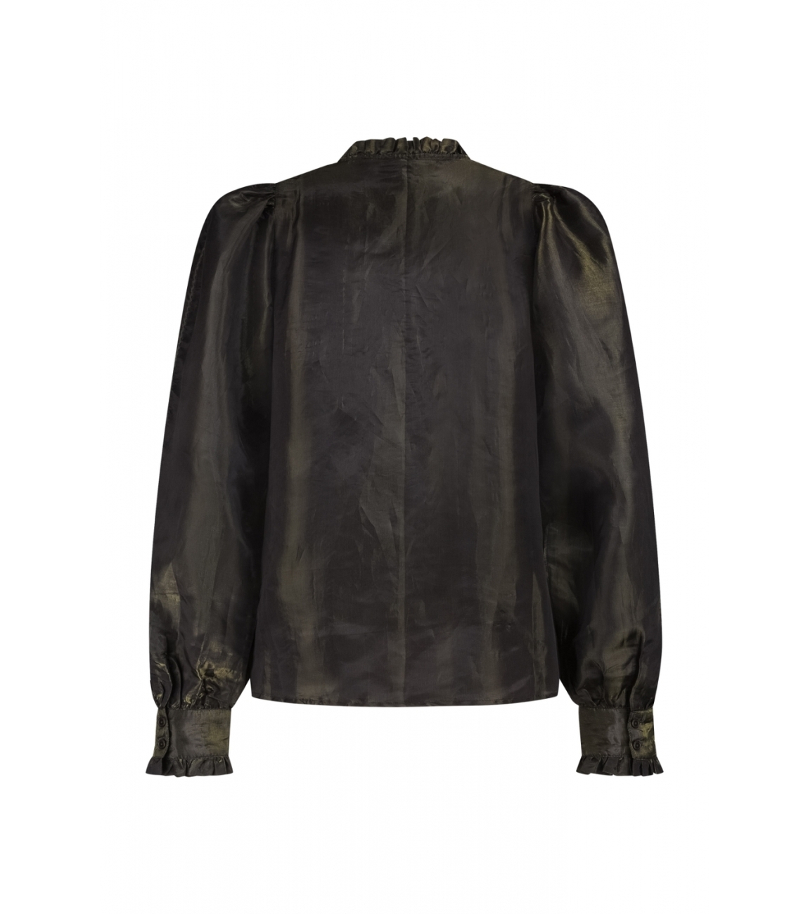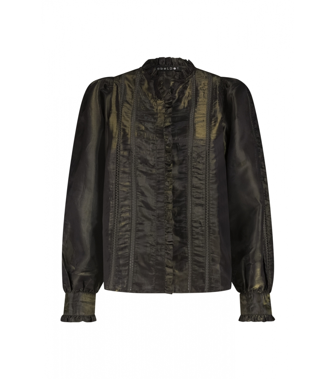 Label Dot blouse Albertine 2521039. Dit glanzende rechtvallend model is voorzien van een ronde hals en heeft lange pofmouwen. Deze khaki kleurige blouse van Label Dot sluit door middel van knopen en is bewerkt met ruches bij de hals, mouwen en knoopsluiting.