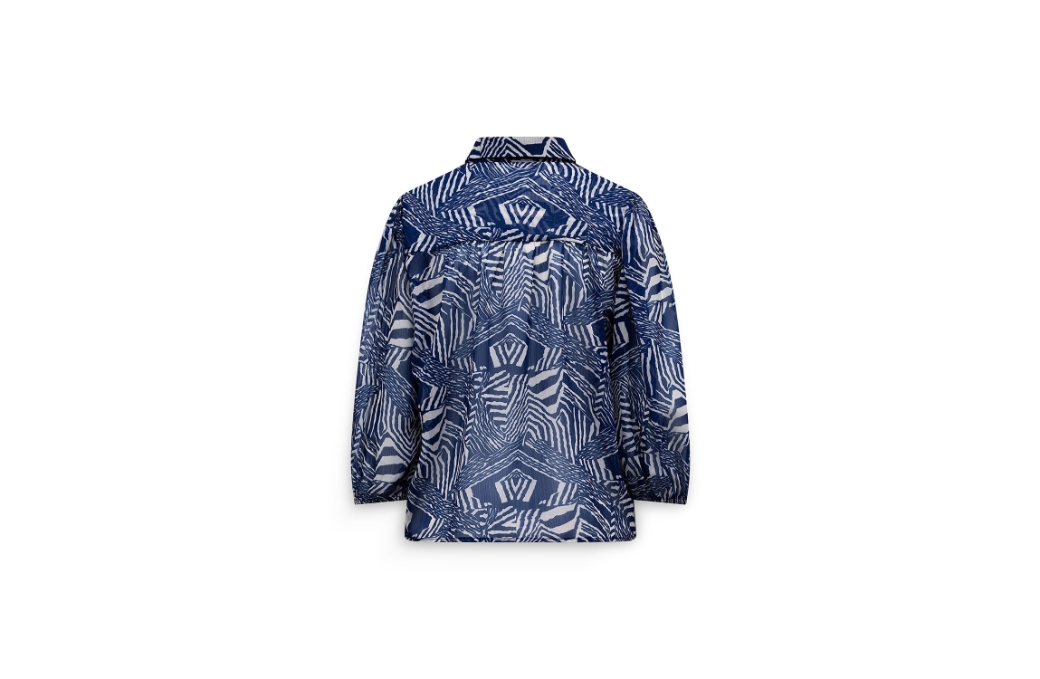 Label Dot blouse Alexis 2611001. Dit rechtvallend model is voorzien van een kraag en heeft driekwart mouwen met elastische boorden. Deze donkerblauwe/beige blouse van Label Dot sluit door middel van knopen en is all-over bewerkt met een grafische print. Dit model is semi transparant uitgevoerd.