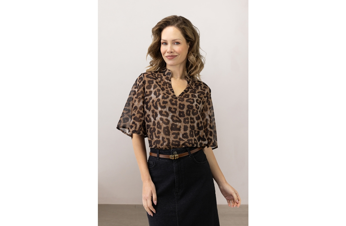 Label Dot top Aline 2511026. Dit rechtvallend model is voorzien van een ronde hals met v-inkeping en heeft korte sierlijke mouwen. Deze zwarte/bruine top van Label Dot is bewerkt met panterprint en is doorschijnend.