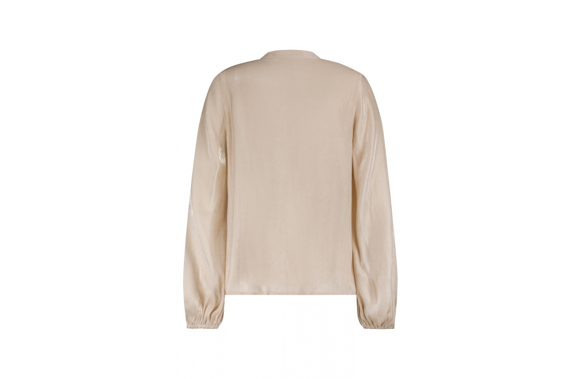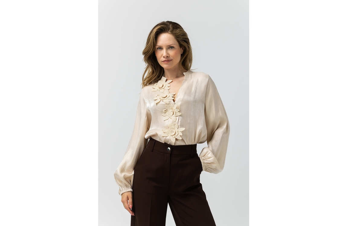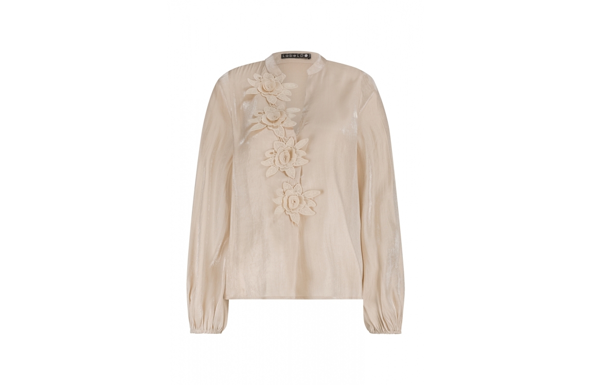 Label Dot blouse Ally 2521023. Dit rechtvallend model is voorzien van een ronde hals met v-inkeping afgewerkt met geborduurde bloemen. Deze beige blouse van Label Dot heeft lange mouwen en is all-over glanzend uitgevoerd.