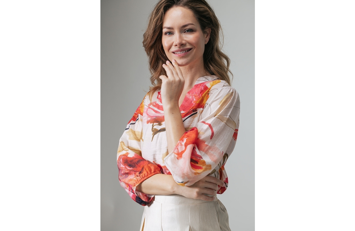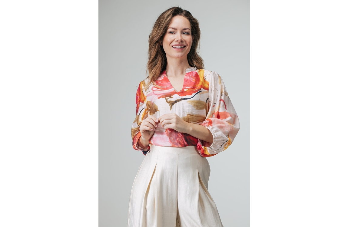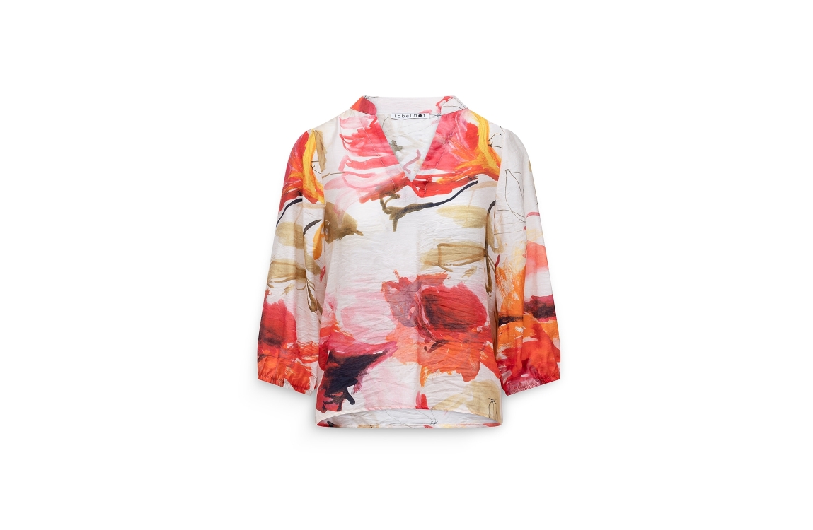 Label Dot Aman 999 blouse. Dit soepelvallend model heeft een v-hals en driekwart mouwen. Deze roze blouse van Label Dot is bewerkt met een all-over bloemenpatroon en uitgevoerd in een semi transparant materiaal.