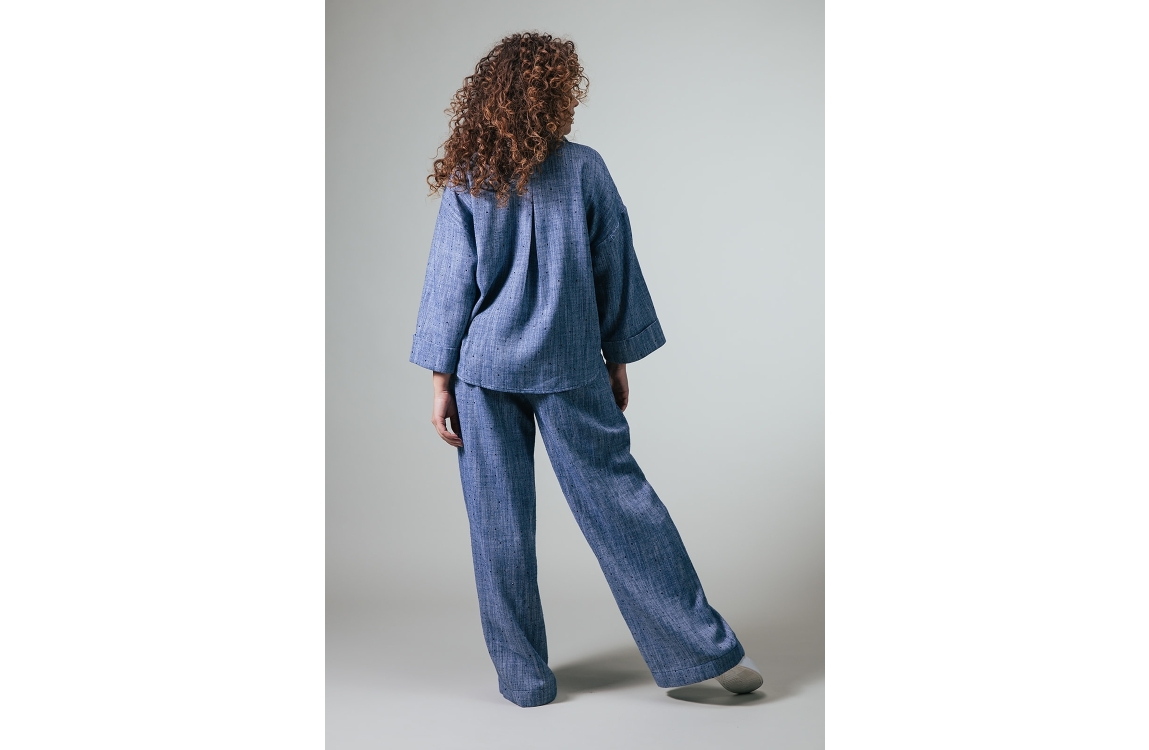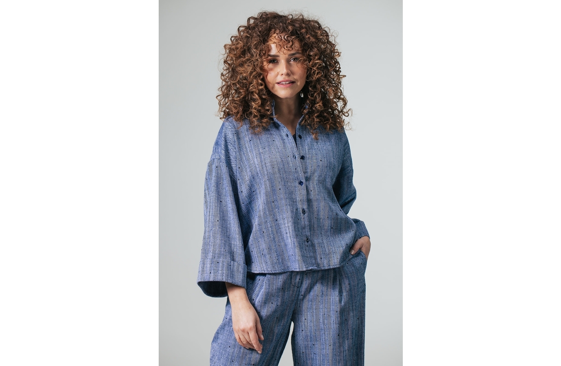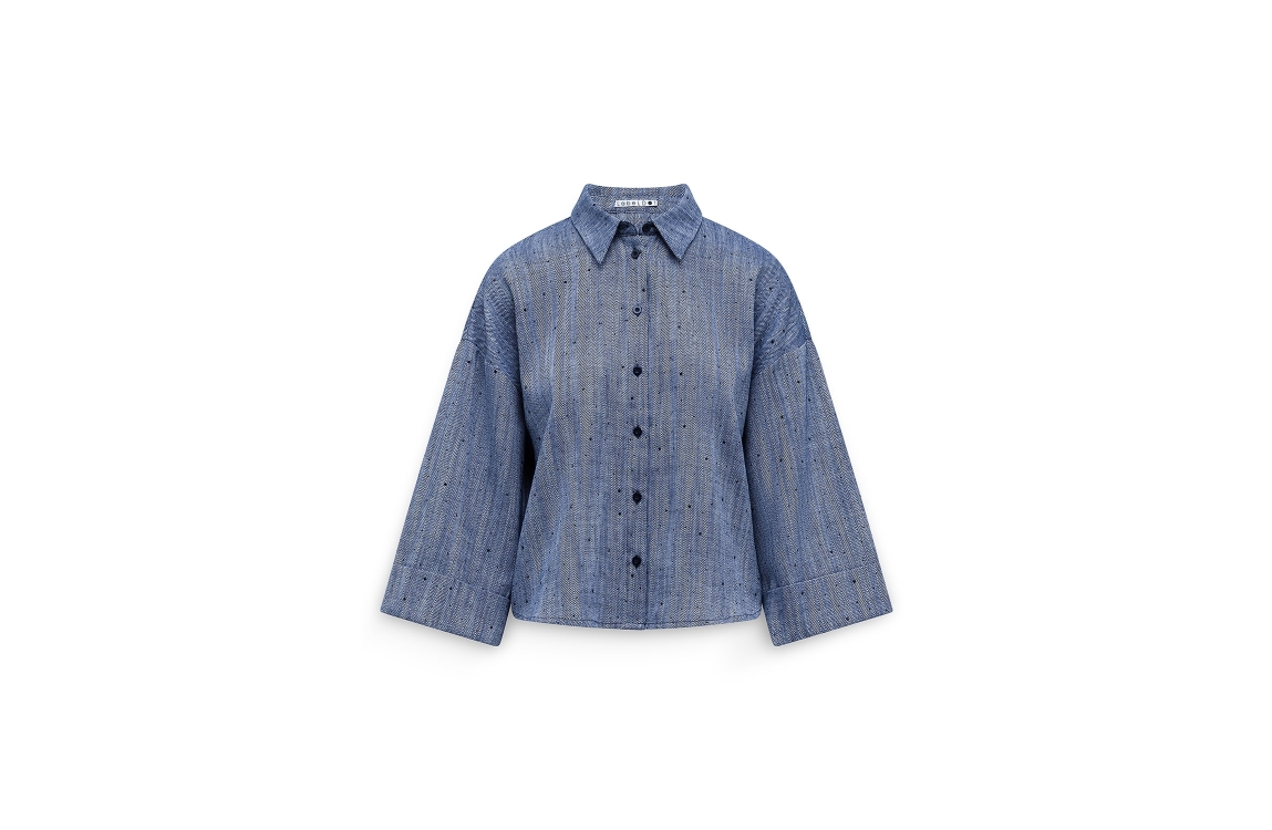 Label Dot blouse Amber 2611037. Dit wijdvallend model is voorzien van een kraag en heeft driekwart mouwen afgewerkt met een omslag. Deze donkerblauwe blouse van Label Dot sluit door middel van knopen en is all-over bewerkt met een gevlochten structuur en met strass steentjes.