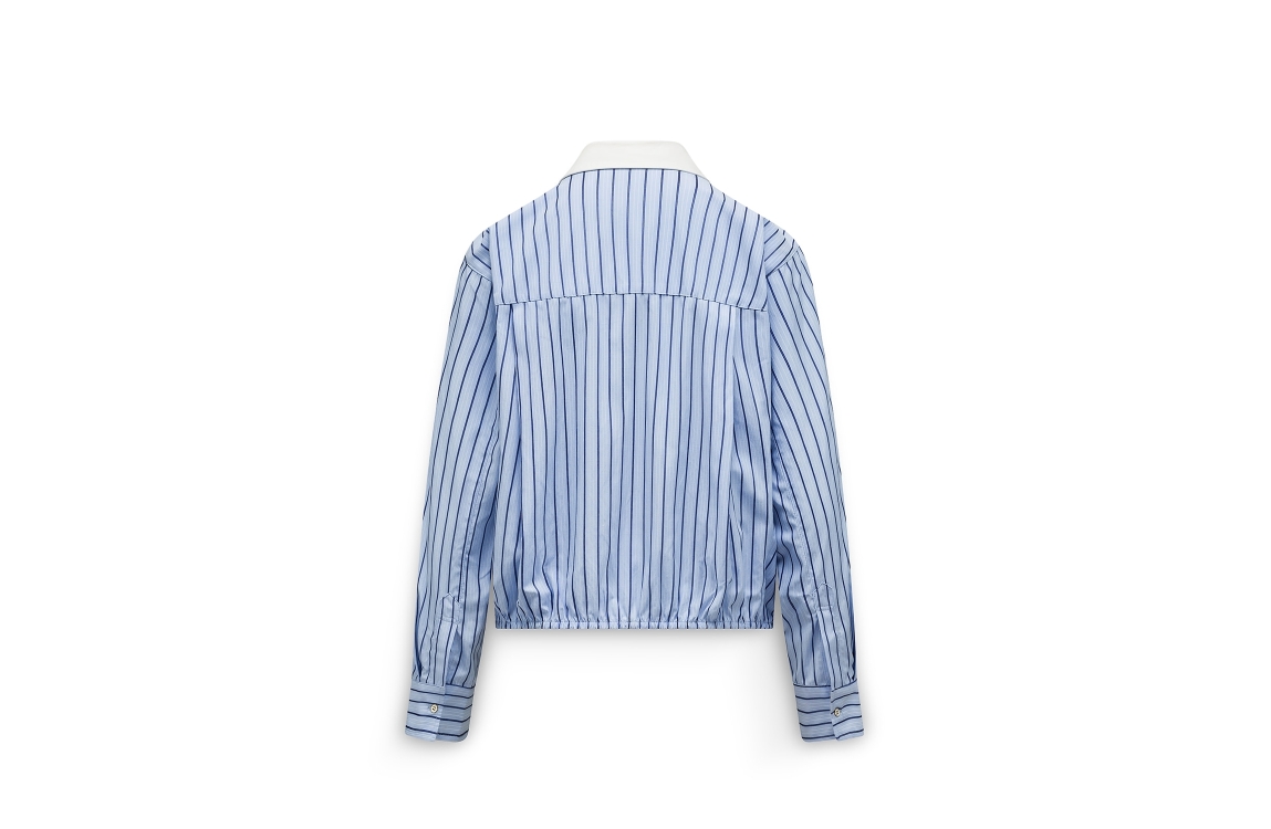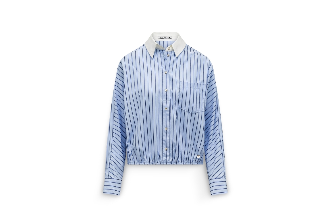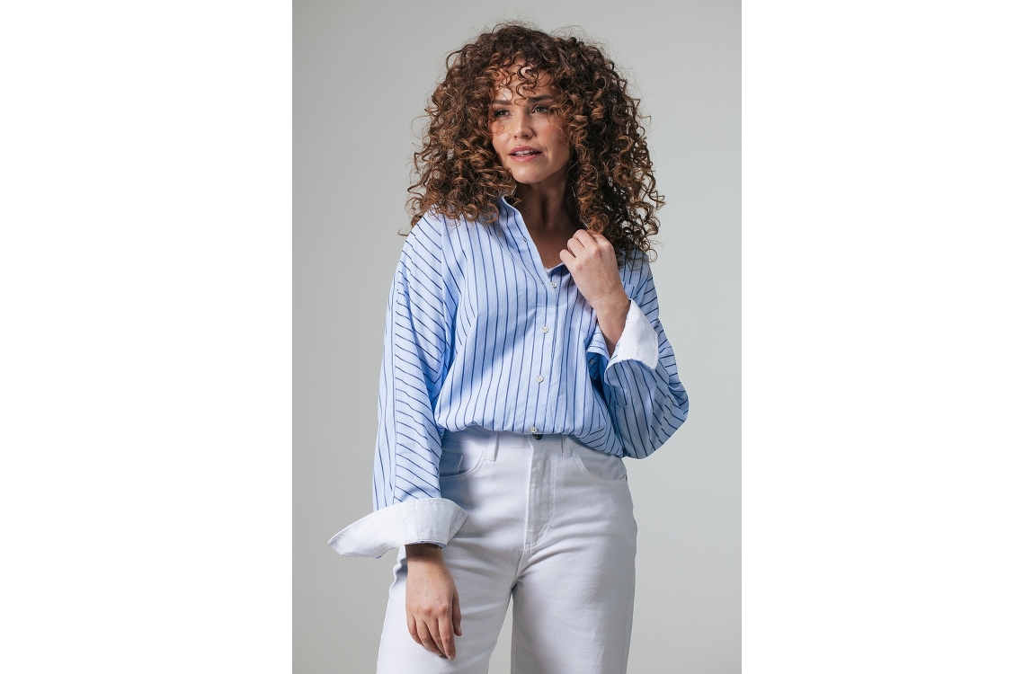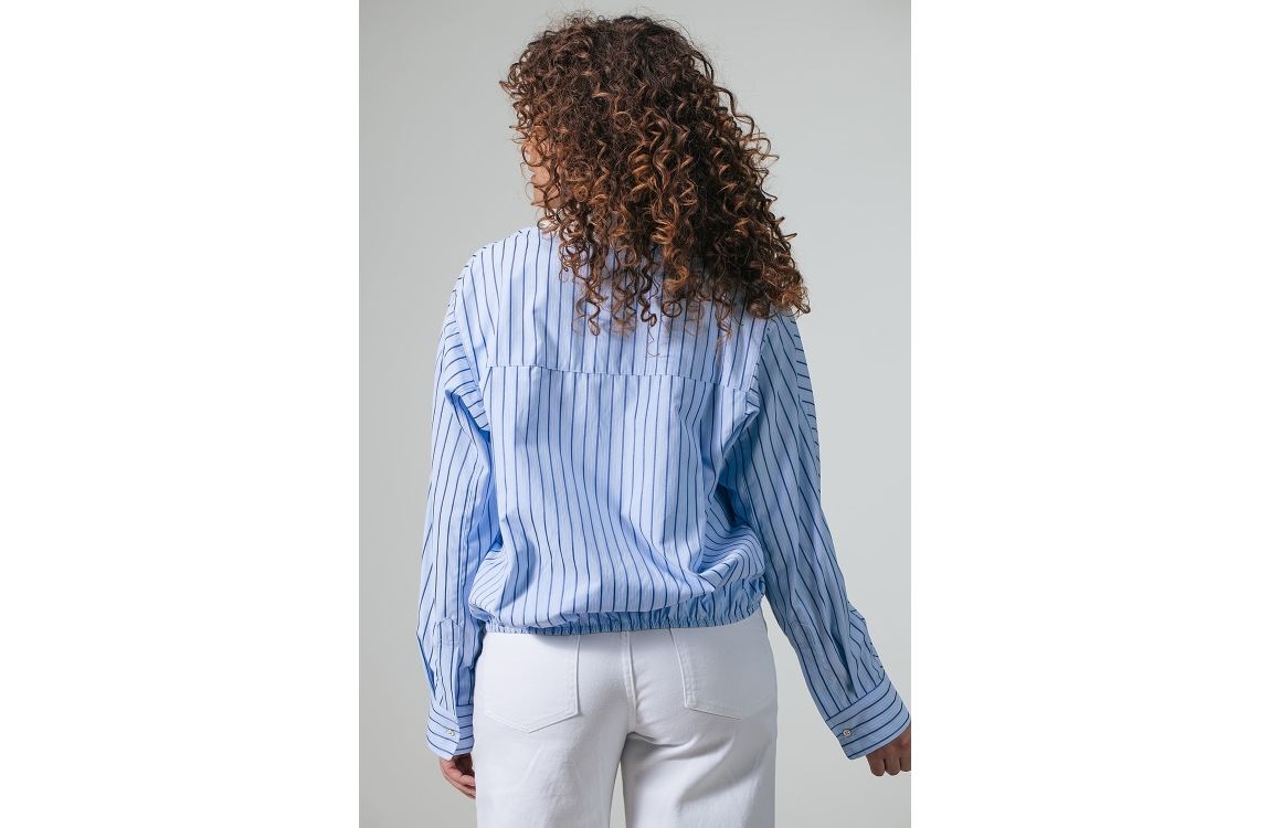 Label Dot blouse Amilia 2611004. Dit cropped oversized fit is voorzien van een kraag en heeft lange mouwen. Deze blauwe gestreepte blouse van Label Dot sluit door middel van knopen en beschikt aan de onderzijde van een elastische boord.