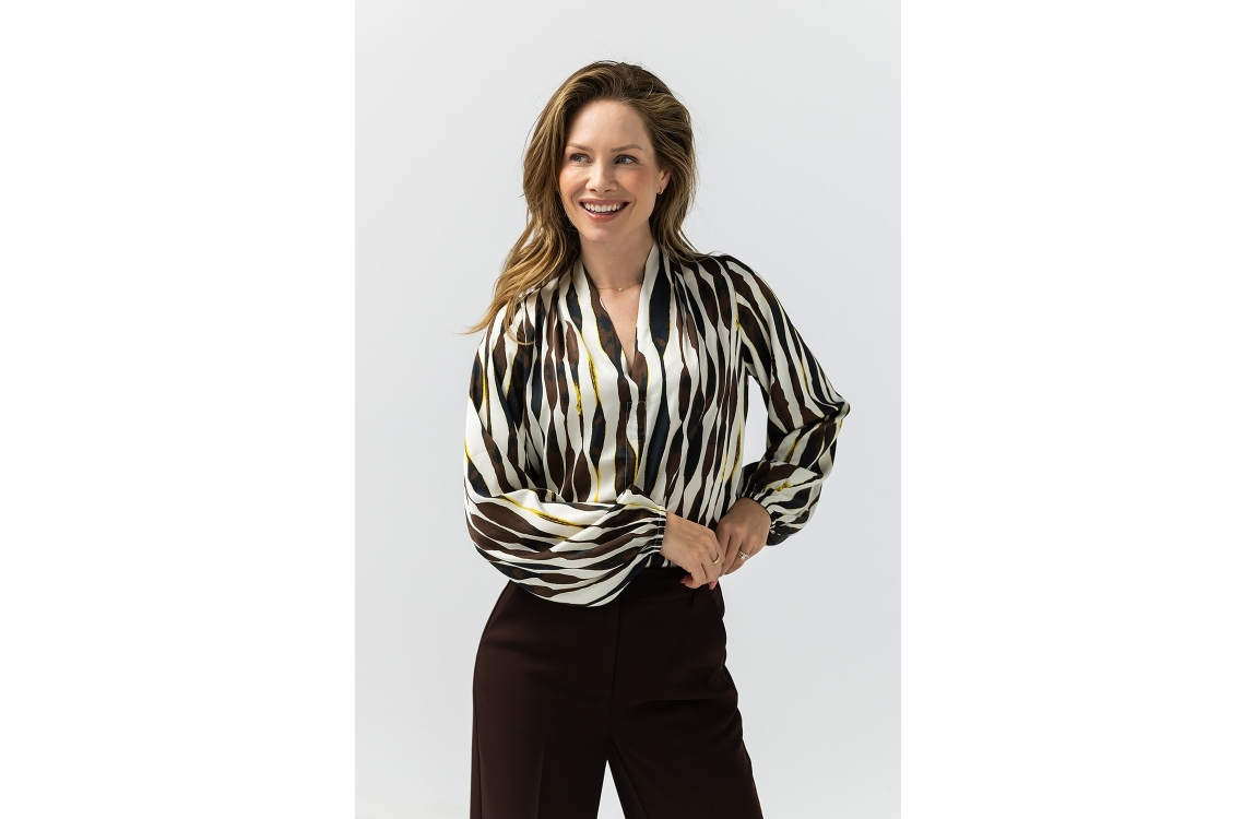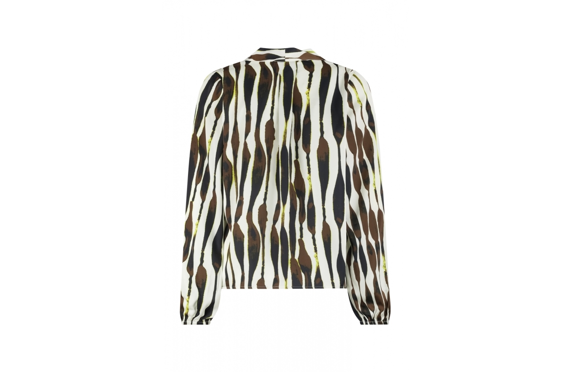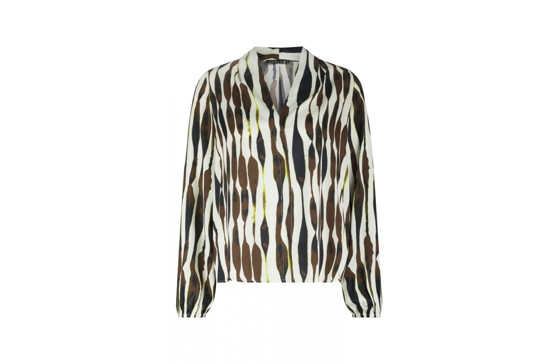 Label Dot blouse Ange 2521044. Dit rechtvallend model is voorzien van een v-hals en heeft lange mouwen. Deze bruine blouse van Label Dot is bewerkt met een print in de kleuren wit, donkerblauw en geel.