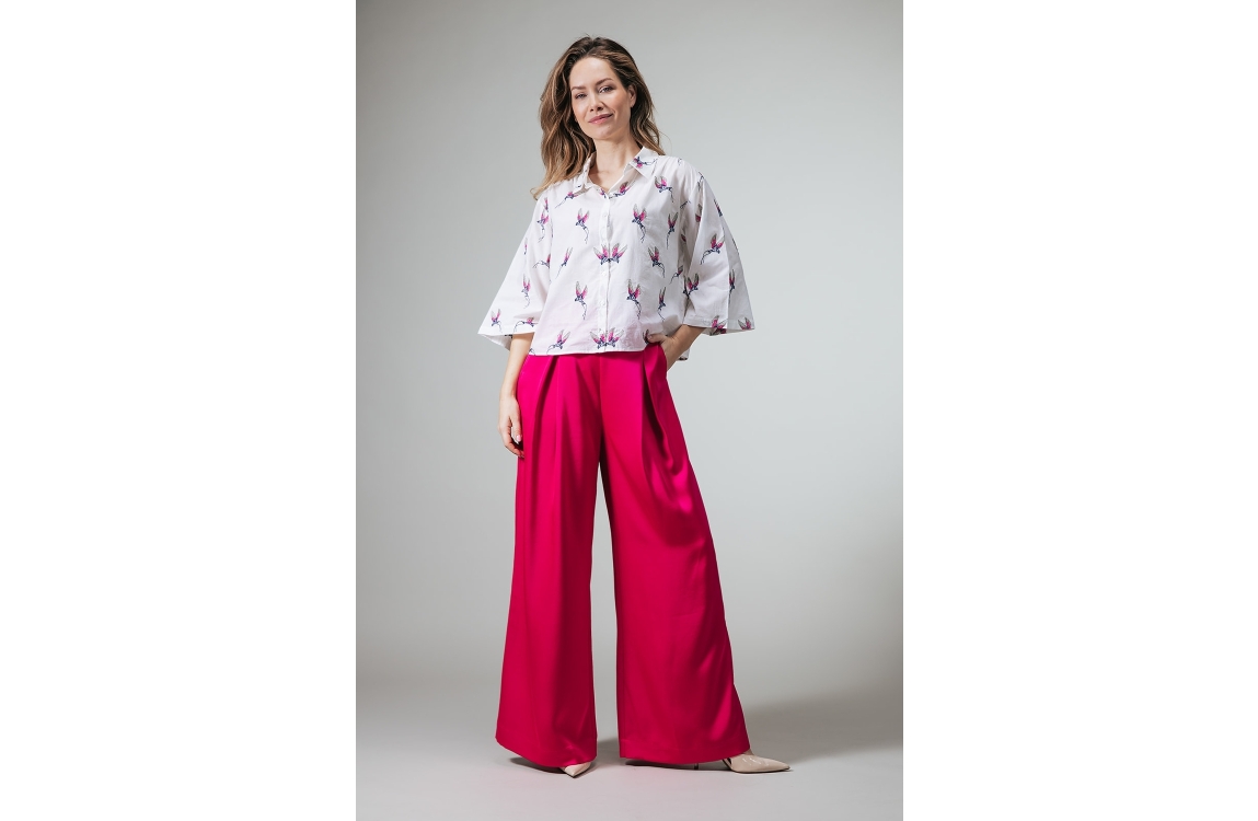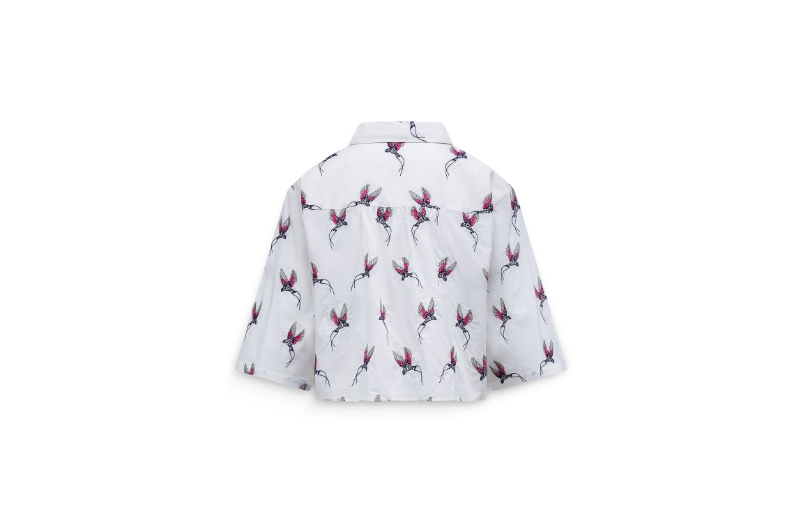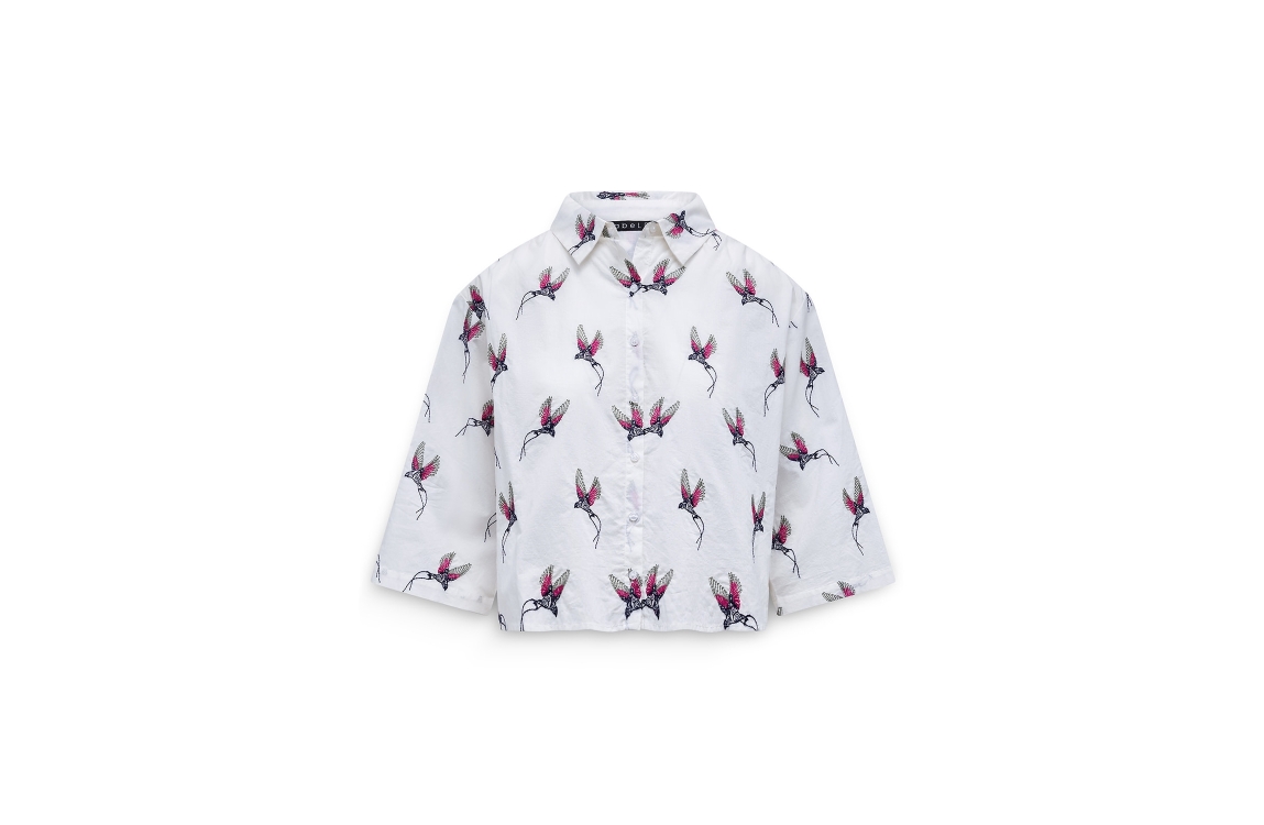 Label Dot 2611043 150. Dit soepelvallende model heeft een kraag en wijde driekwartmouwen met gedropte schoudernaden. Deze witte blouse van Label Dot sluit aan de voorzijde door middel van knopen en is all-over bewerkt met zwaluwen in verschillende kleuren.