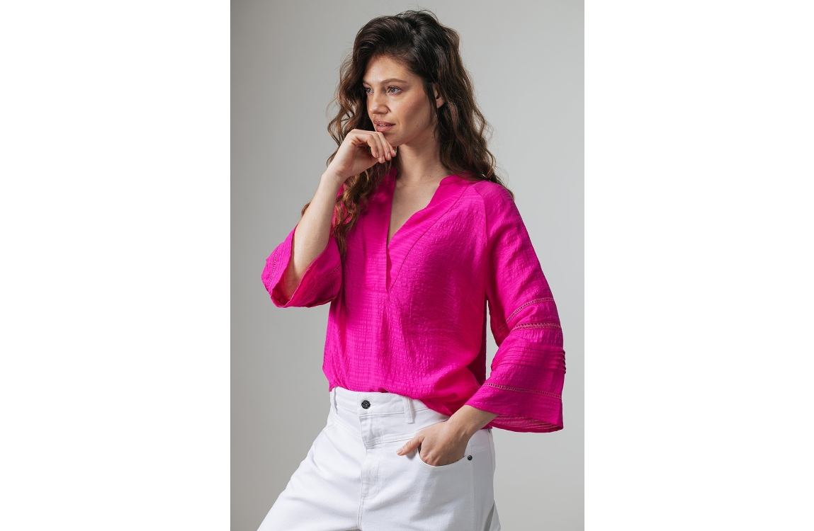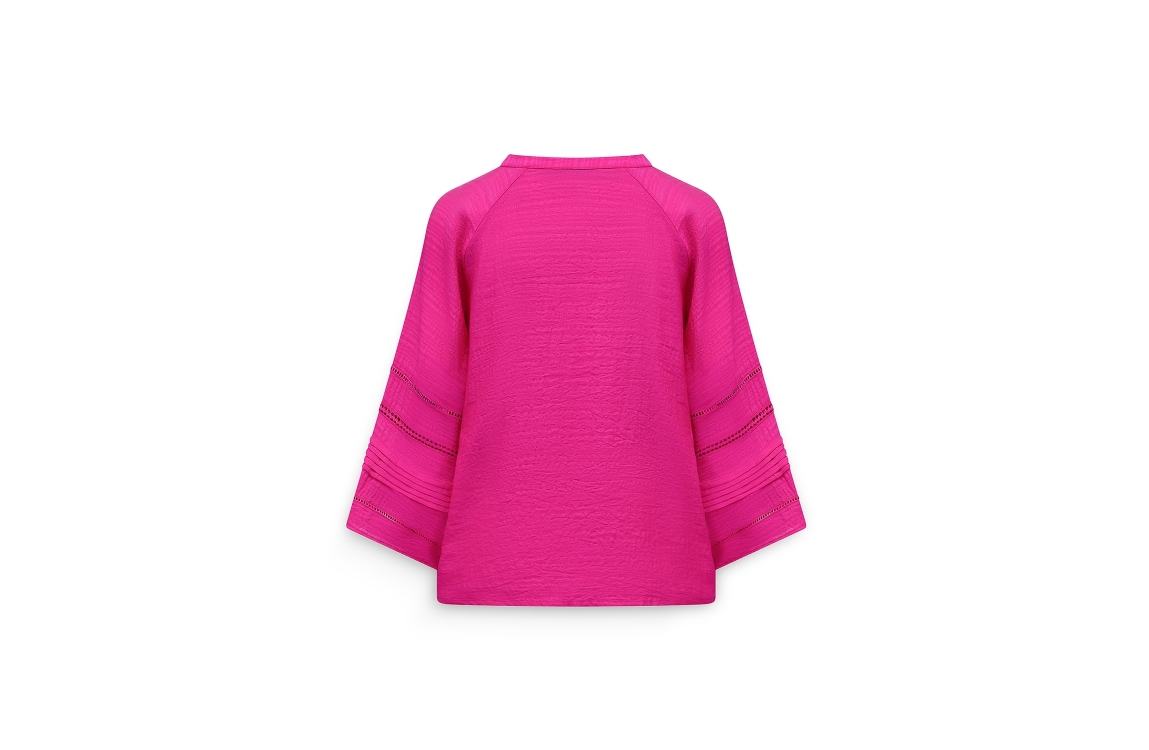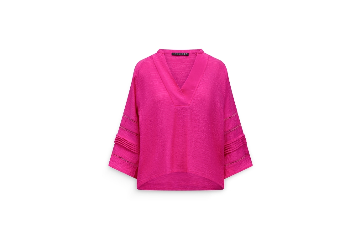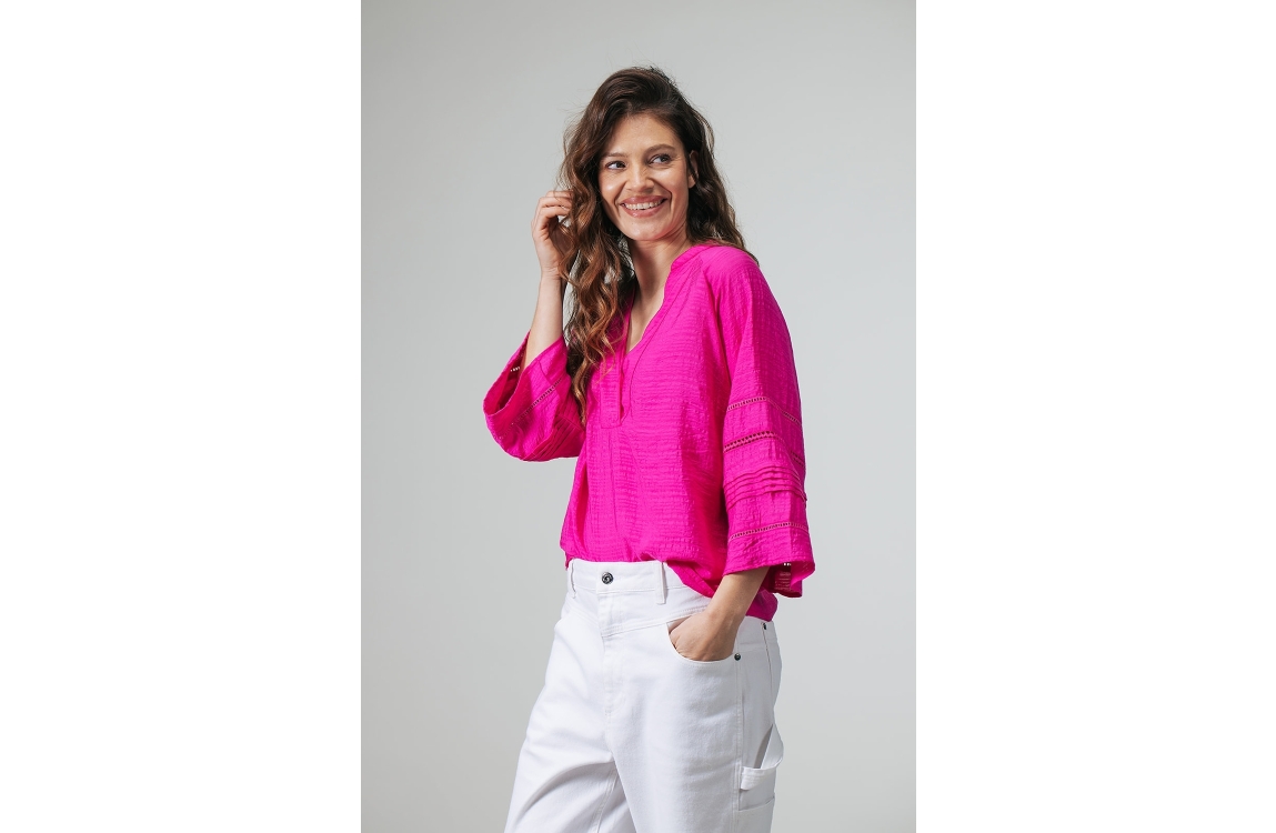 Label Dot blouse 2611042 750. Dit wijdvallende model heeft een V-hals en driekwart ranglanmouwen. Deze donkerroze blouse van Label Dot is uitgevoerd in een crinkle-stof en is afgewerkt met broderie details op de mouwen.