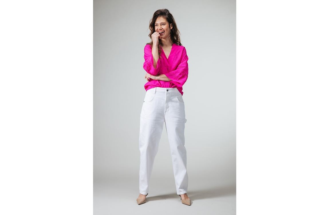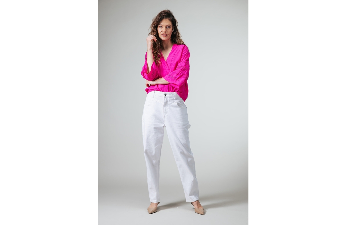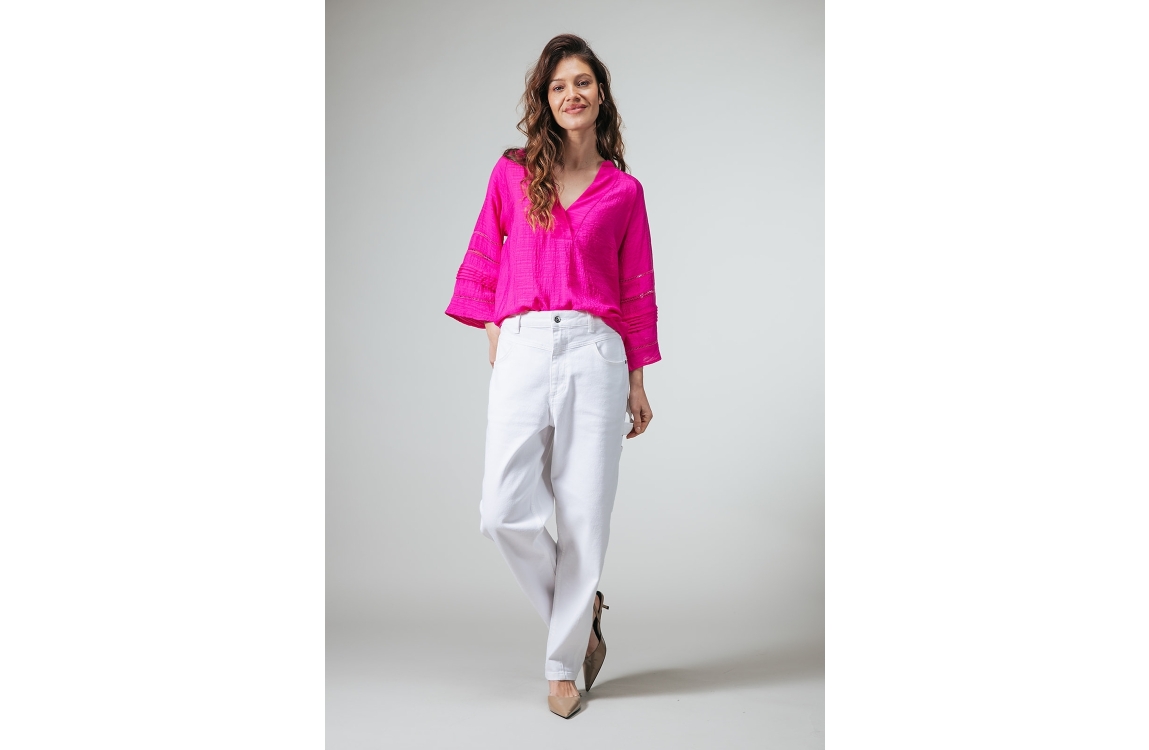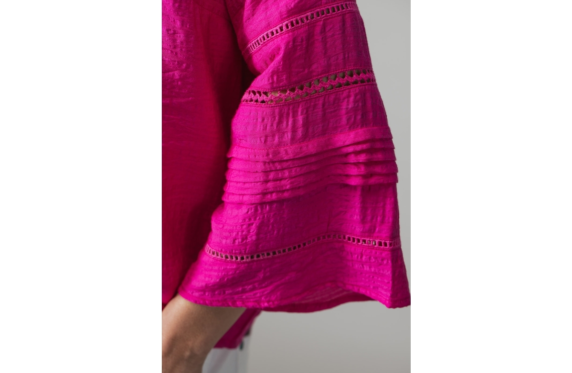 Label Dot blouse 2611042 750. Dit wijdvallende model heeft een V-hals en driekwart ranglanmouwen. Deze donkerroze blouse van Label Dot is uitgevoerd in een crinkle-stof en is afgewerkt met broderie details op de mouwen.