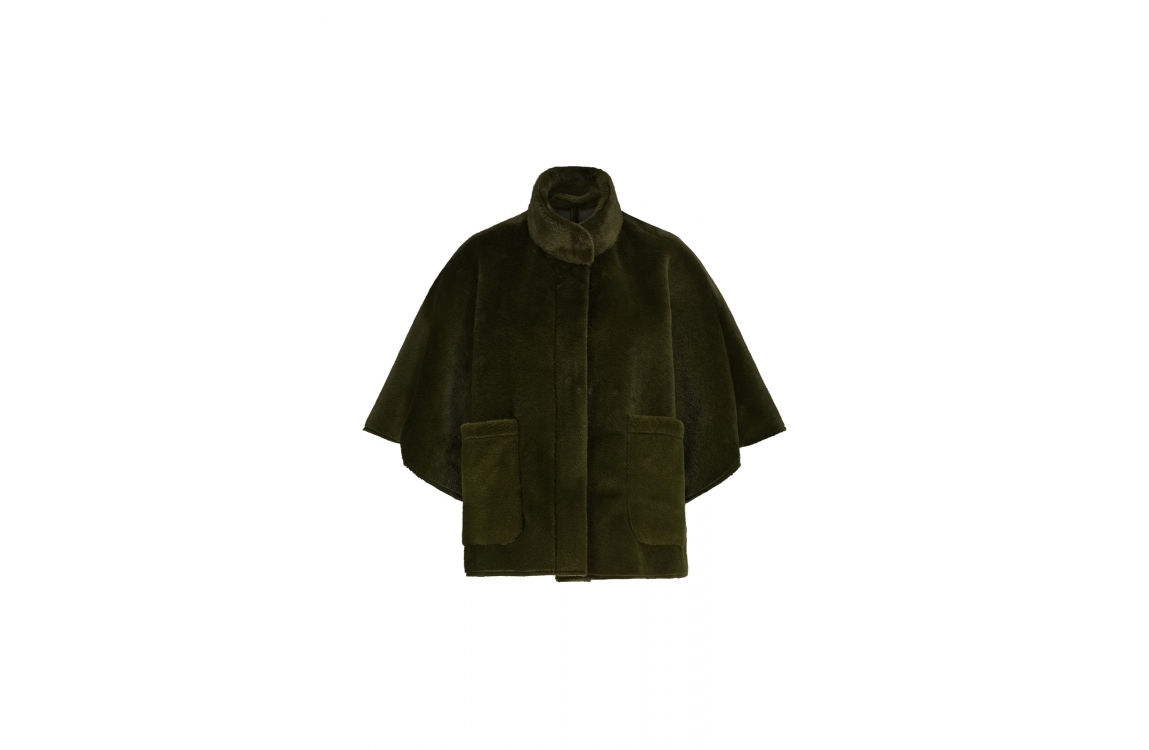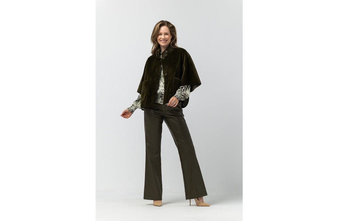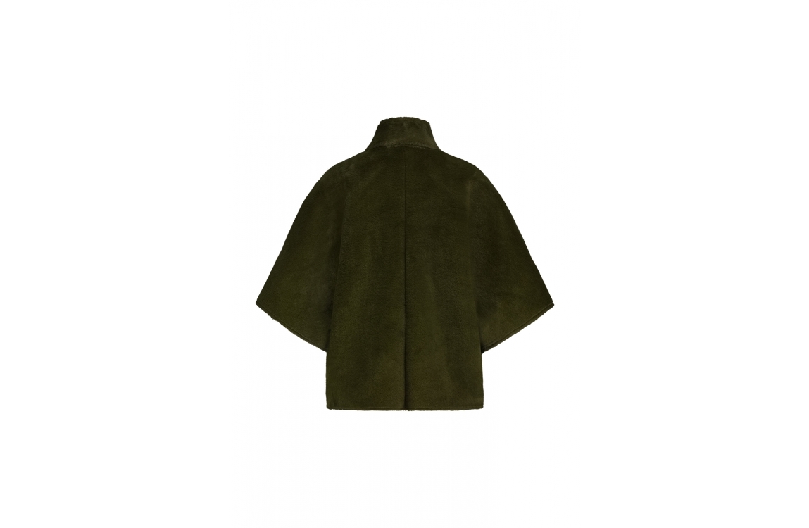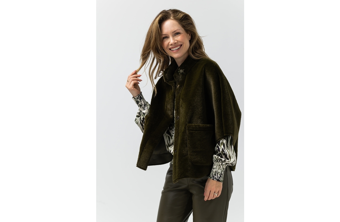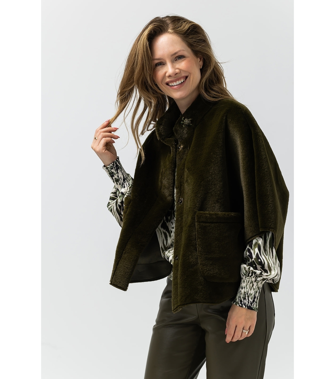 Label Dot jasje Dana 2527003. Dit wijdvallend model is voorzien van een opstaande ronde kraag en heeft driekwart mouwen. Deze groene faux fur cape van Label Dot sluit door middel van knopen, ook bij de mouwen en beschikt over twee opgestikte zakken.