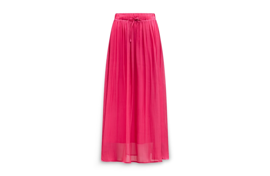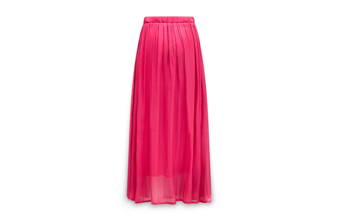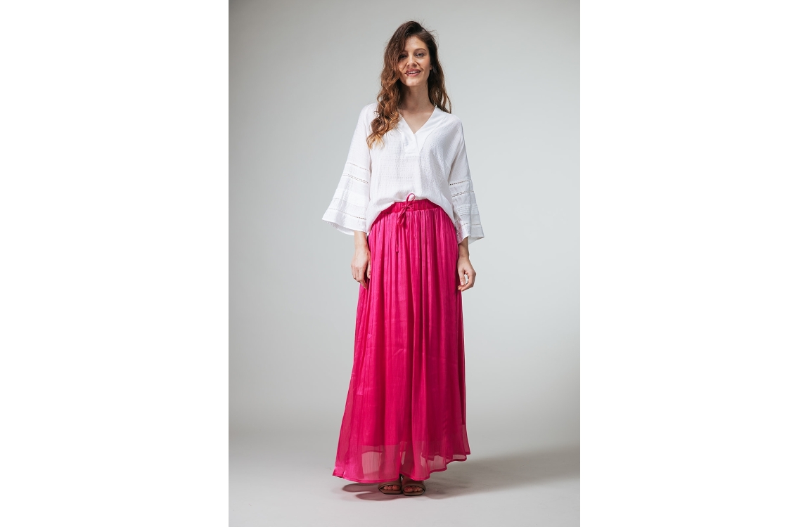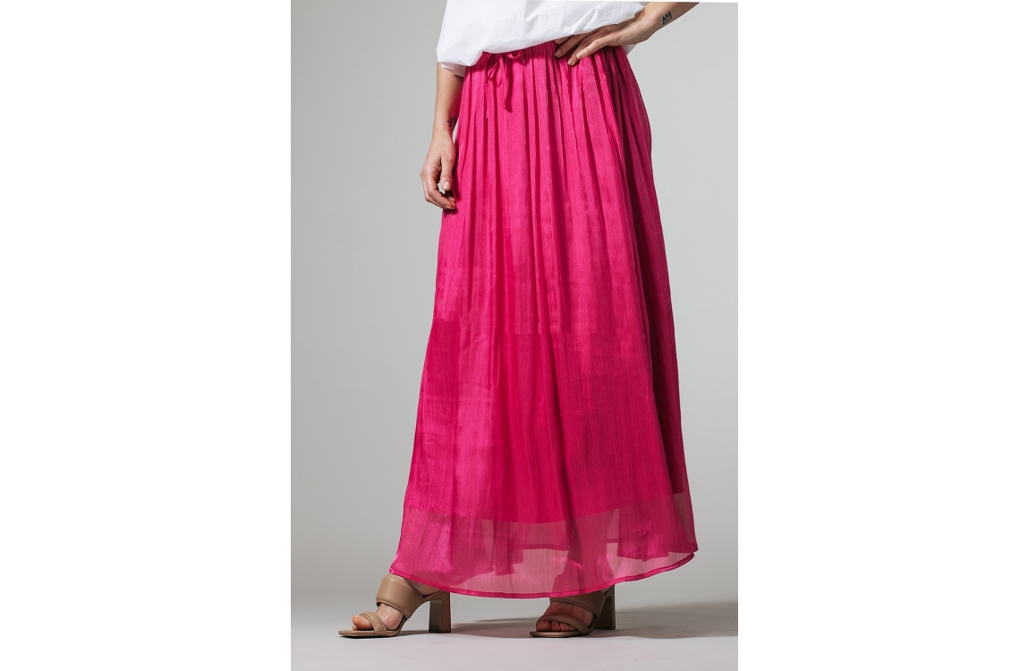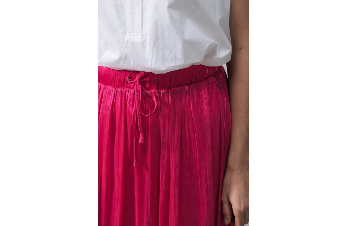 Label Dot Emi 2612002 750. Dit soepelvallende model is voorzien van een elastische boord met striksluiting. Deze roze maxi-rok van Label Dot is bewerkt met een prachtige glans en beschikt over voering.