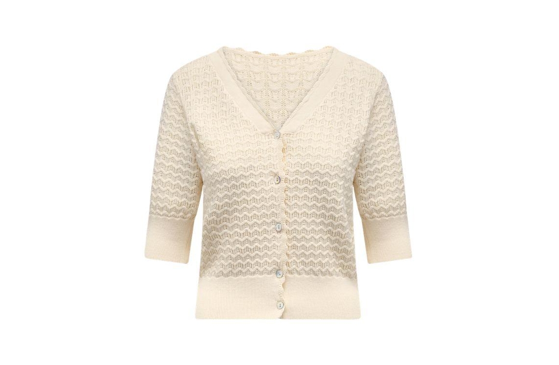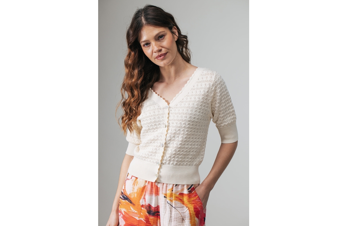 Label Dot vest 2616007 229. Dit rechtvallende model heeft een V-hals, en korte mouwen. Deze beige vest van Label Dot sluit aan de voorzijde door middel van knopen en is uitgevoerd in een opengewerkt breisel met een zigzag ajour patroon. Het model is afgewerkt met ribgebreide boorden.