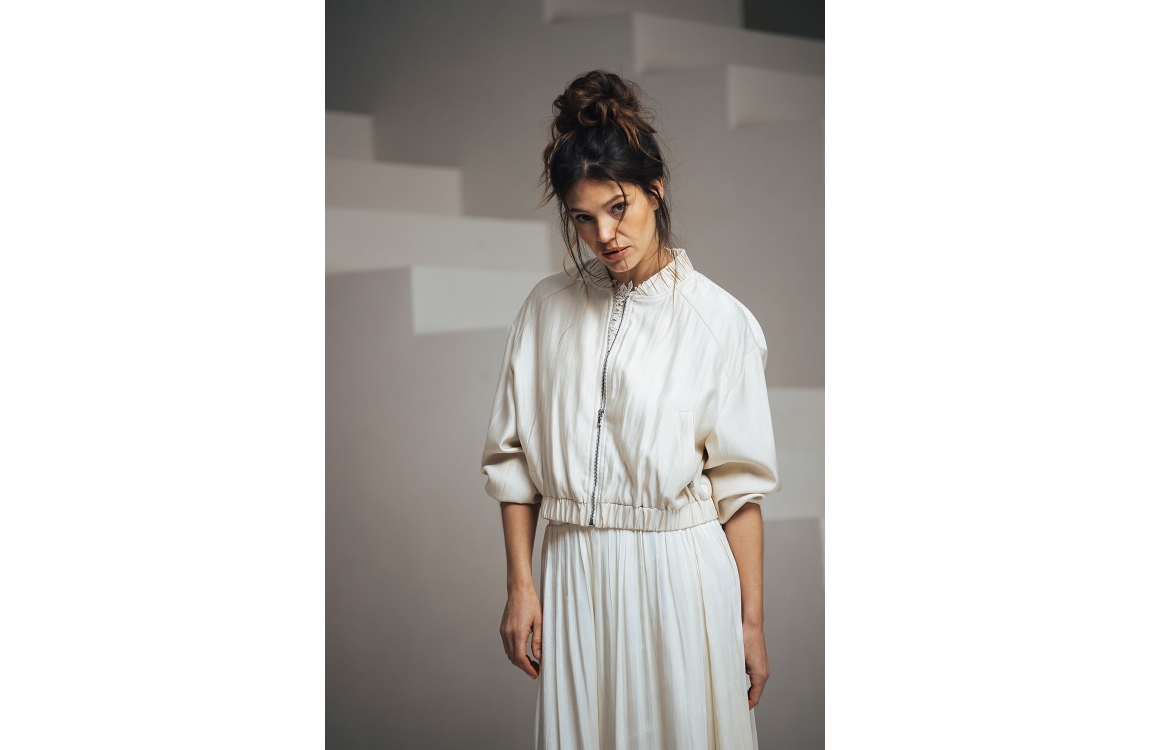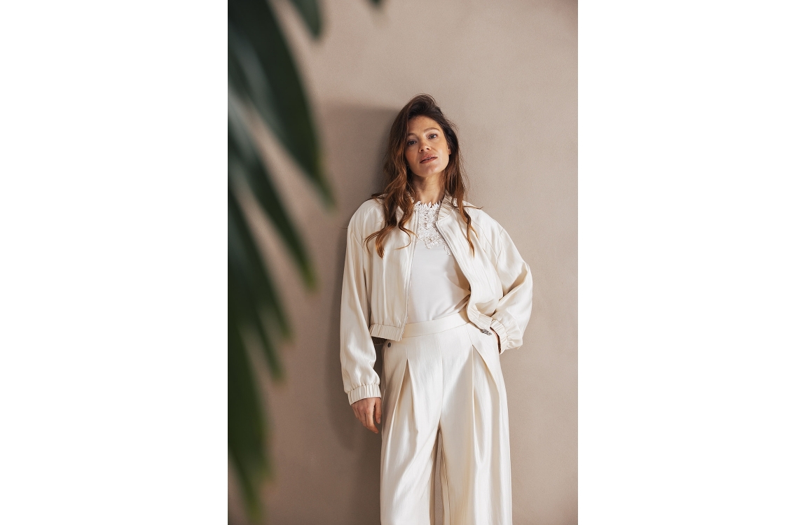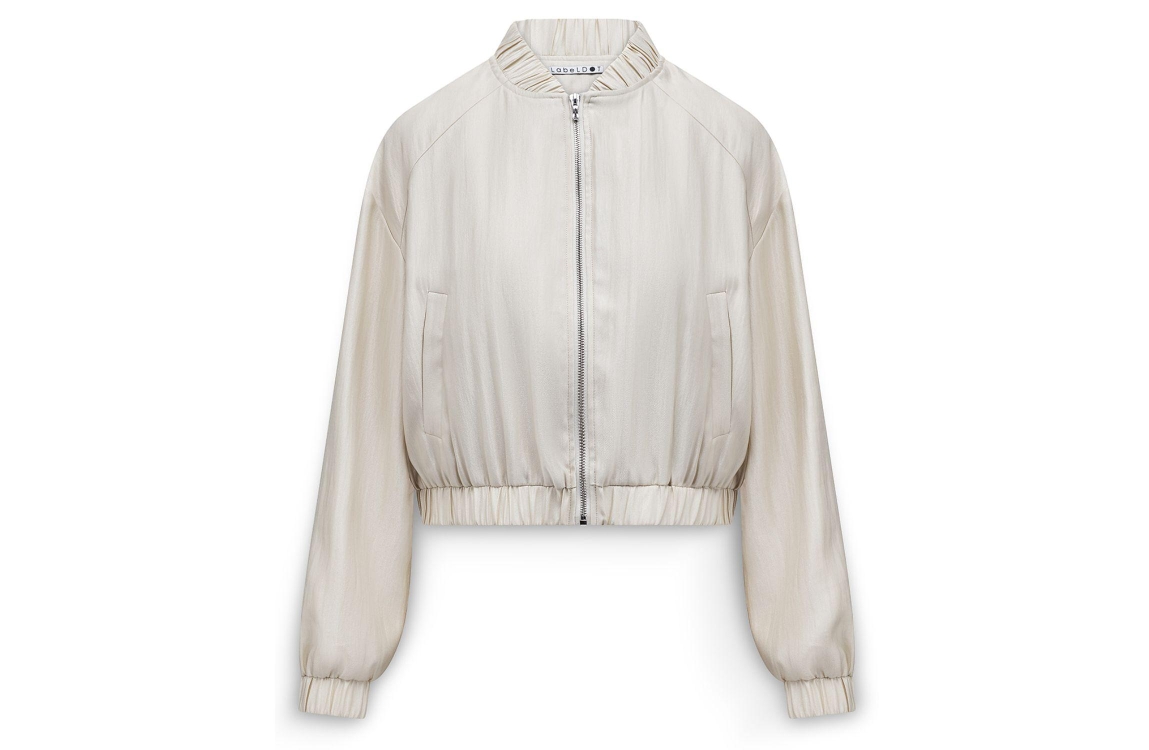 Label Dot Larissa 200 off white. Dit rechtvallende model is voorzien van een ronde hals en heeft lange mouwen. Dit wit/beige kleurige bomber jasje van Label Dot sluit door middel van een rits en is all-over bewerkt met glans. Dit model is afgewerkt met elastische boorden en twee steekzakken aan de voorzijde.