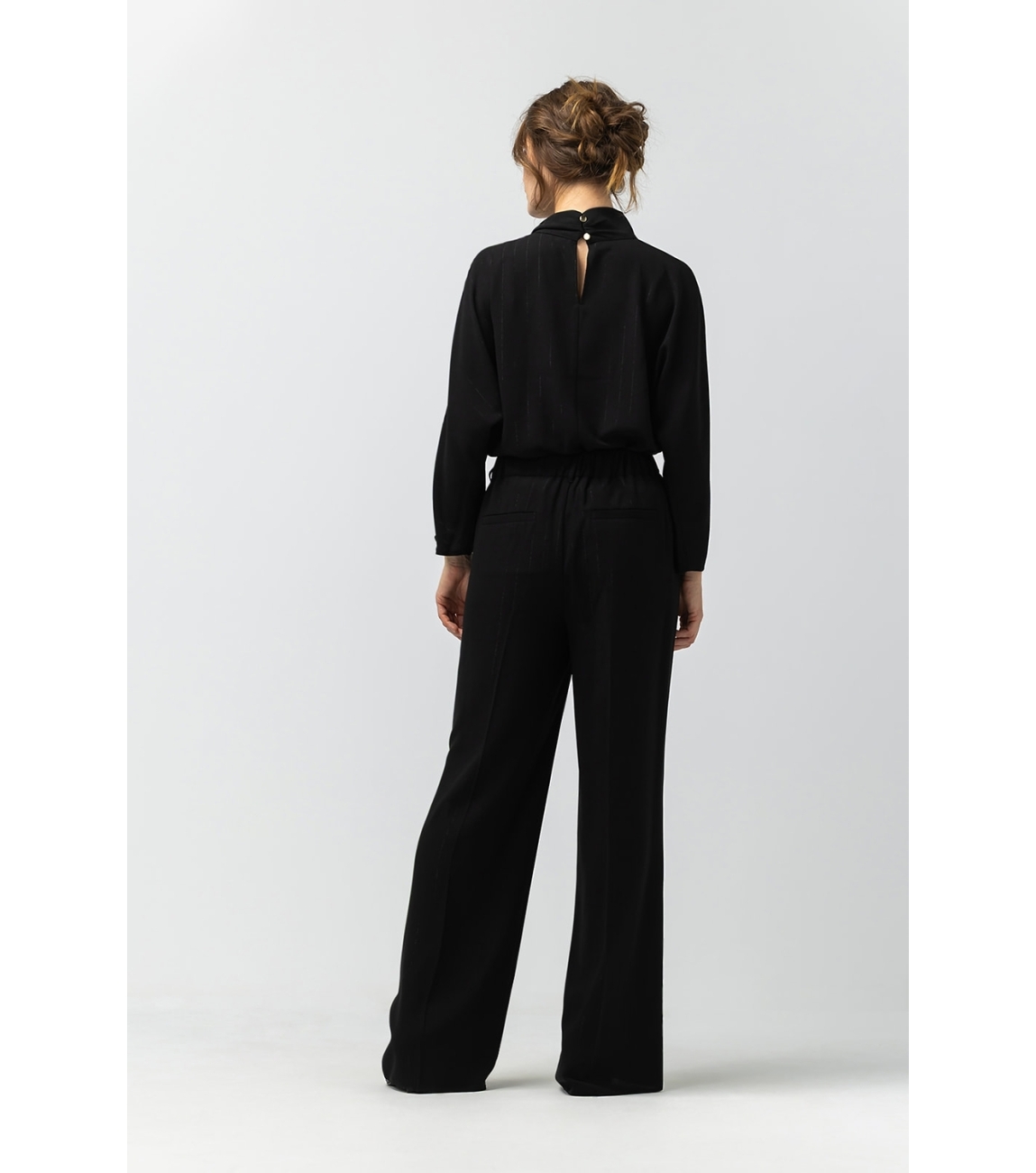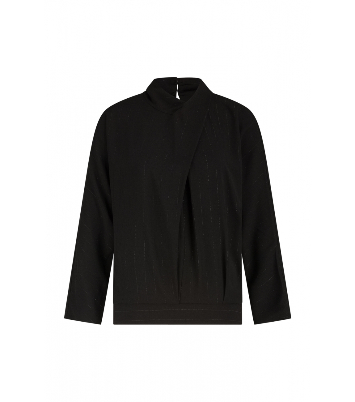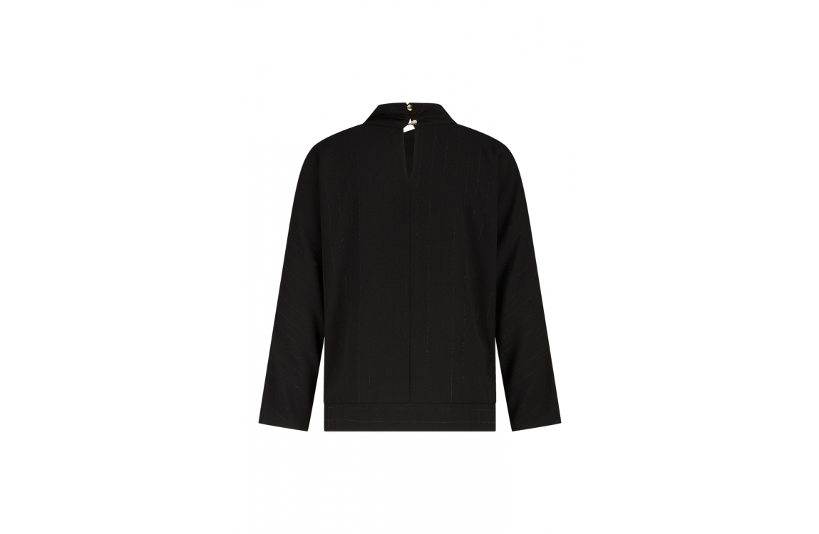 Label Dot blouse Malin 2525005. Dit rechtvallend model is voorzien van een hoge ronde hals afgewerkt met ene overslag detail en heeft lange mouwen. Deze zwarte blouse van Label Dot sluit aan de achterzijde door middel van knoopjes en is all-over bewerkt met een lurexdraadje.