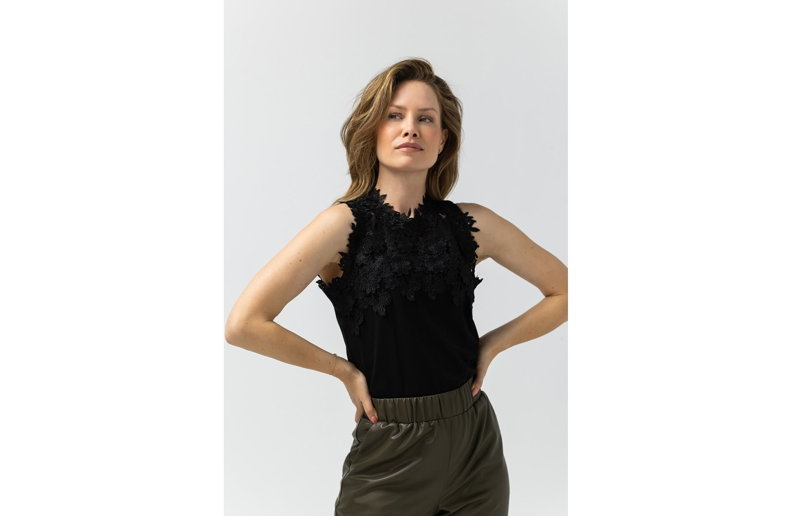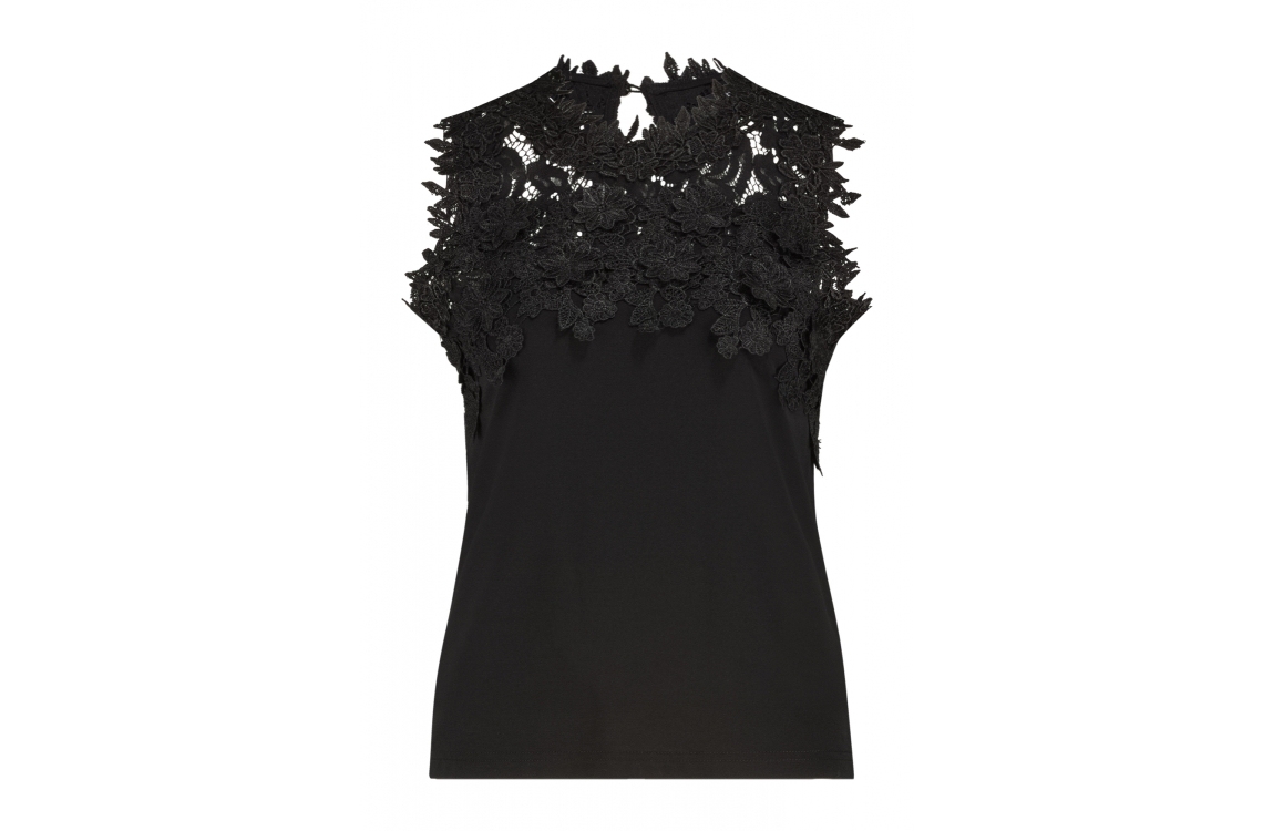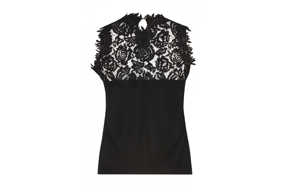 Label Dot top Margo. Dit rechtvallend model is voorzien van een ronde hals en is mouwloos. Deze zwarte top van Label Dot sluit aan de achterzijde door middel van een knoopje en is aan de bovenzijde bewerkt met kant.