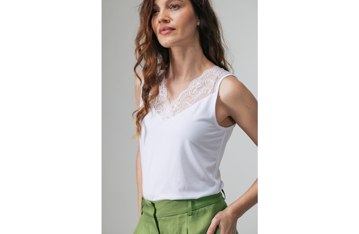 Label Dot top Max 2615008. Dit rechtvallend model is voorzien van een v-hals en is mouwloos. Deze witte top van Label Dot is bij de hals bewerkt met kant.