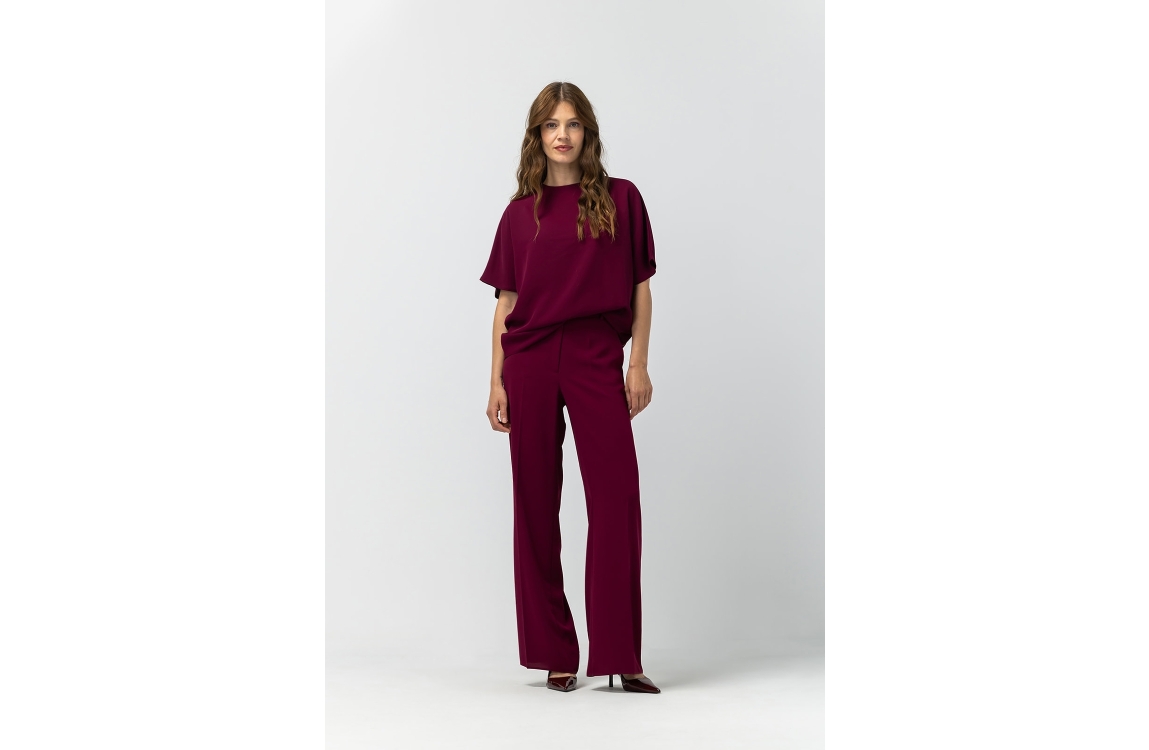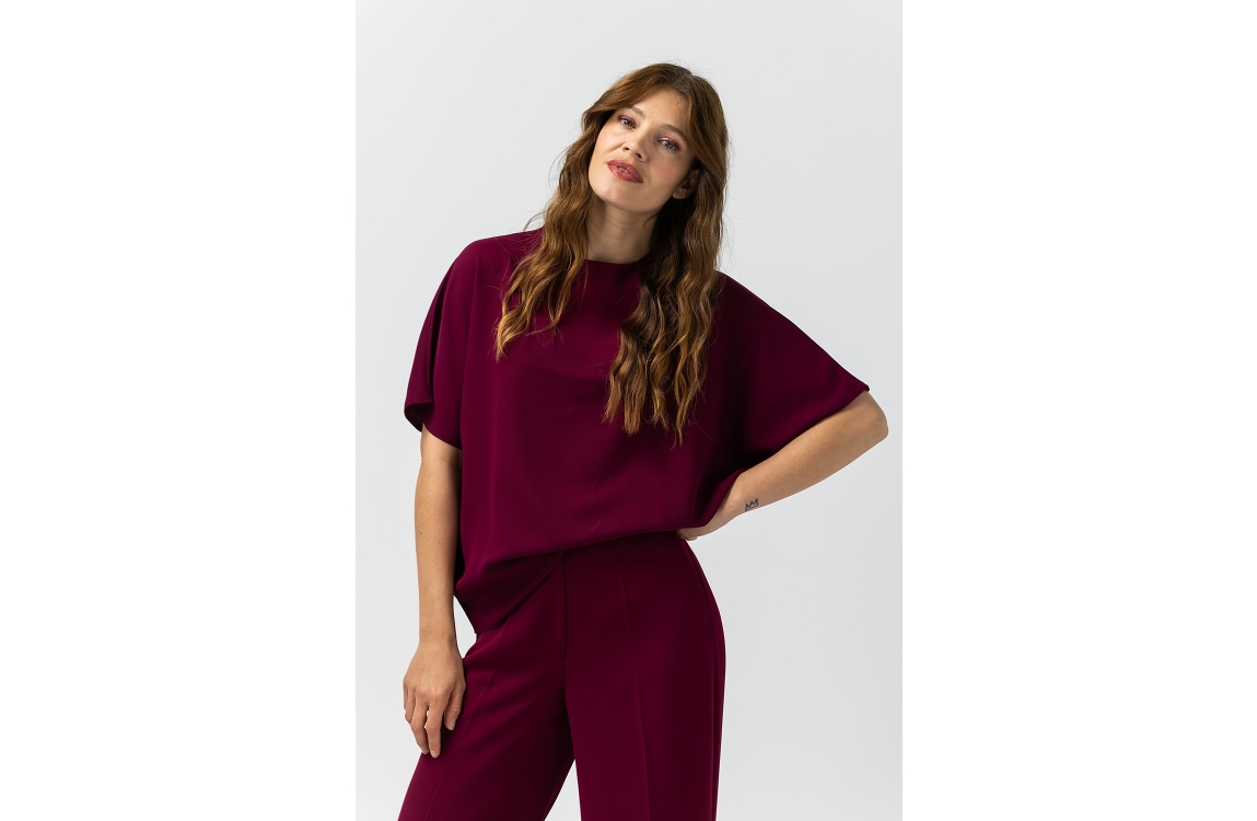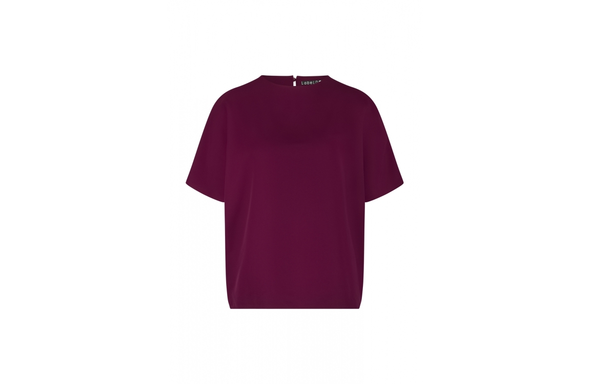 Label Dot shirt Mea. Dit wijdvallend model is voorzien van een hoge ronde hals en heeft korte mouwen. Deze bordeaux kleurige shirt van Label Dot sluit aan de achterzijde door middel van een knoopje.