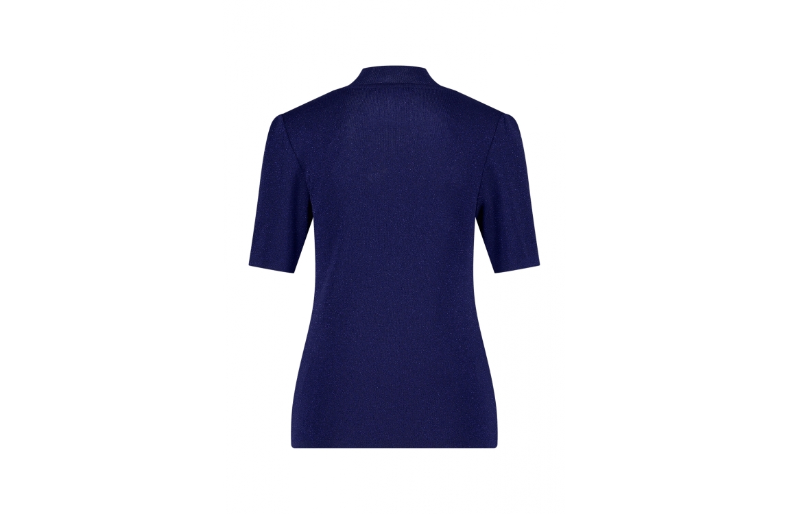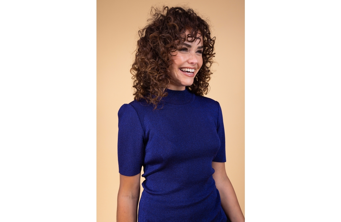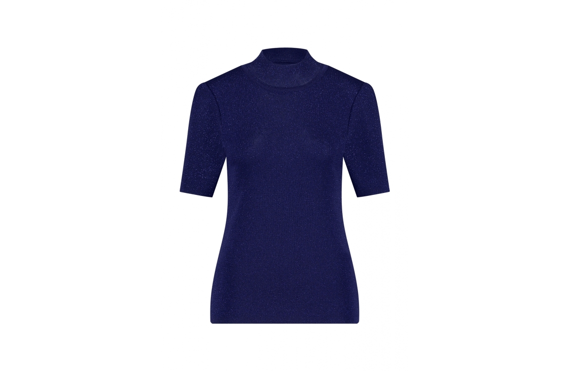 Label Dot top Mira. Dit rechtvallend model is voorzien van een turtle neck en heeft korte pofmouwen. Deze donkerblauwe top van Label Dot is bewerkt met glitter.