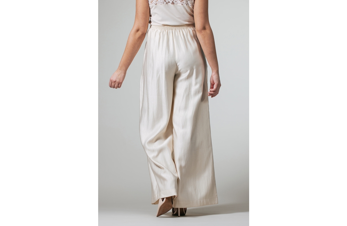 Label Dot Remila 200 off white. Dit wide leg model sluit door middel van een elastische taille band. Deze beige broek van Label Dot is afgewerkt met bandplooien en is bewerkt met een glans. Dit model is voorzien van twee steekzakken aan de voorzijde.