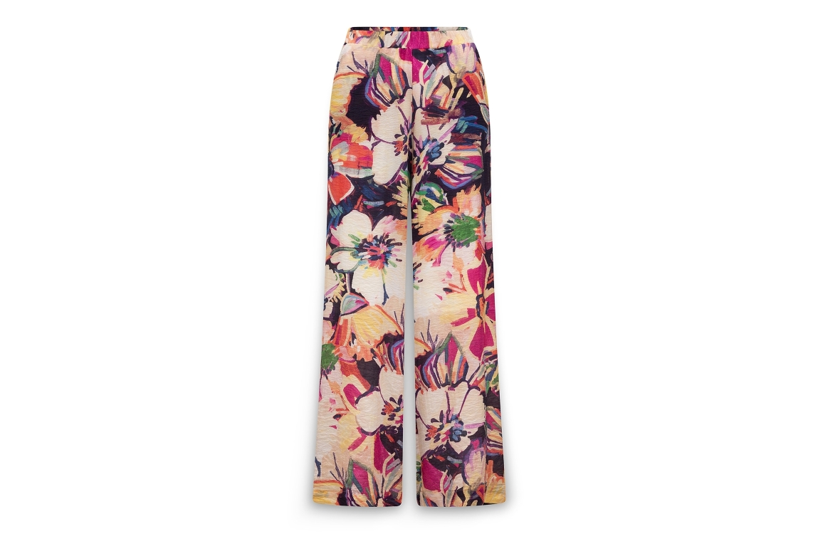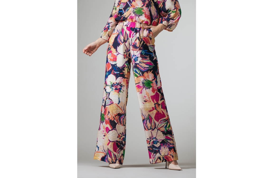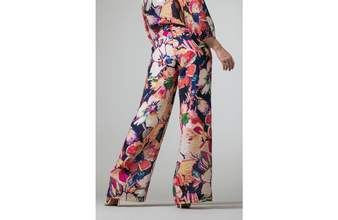 Label Dot broek 2618030 620. Dit wide leg model sluit door middel van een elastische boord. Deze multicolour broek van Label Dot is all-over bewerkt met een bloemenprint in verschillende kleuren en is voorzien van twee steek- en paspelzakken.