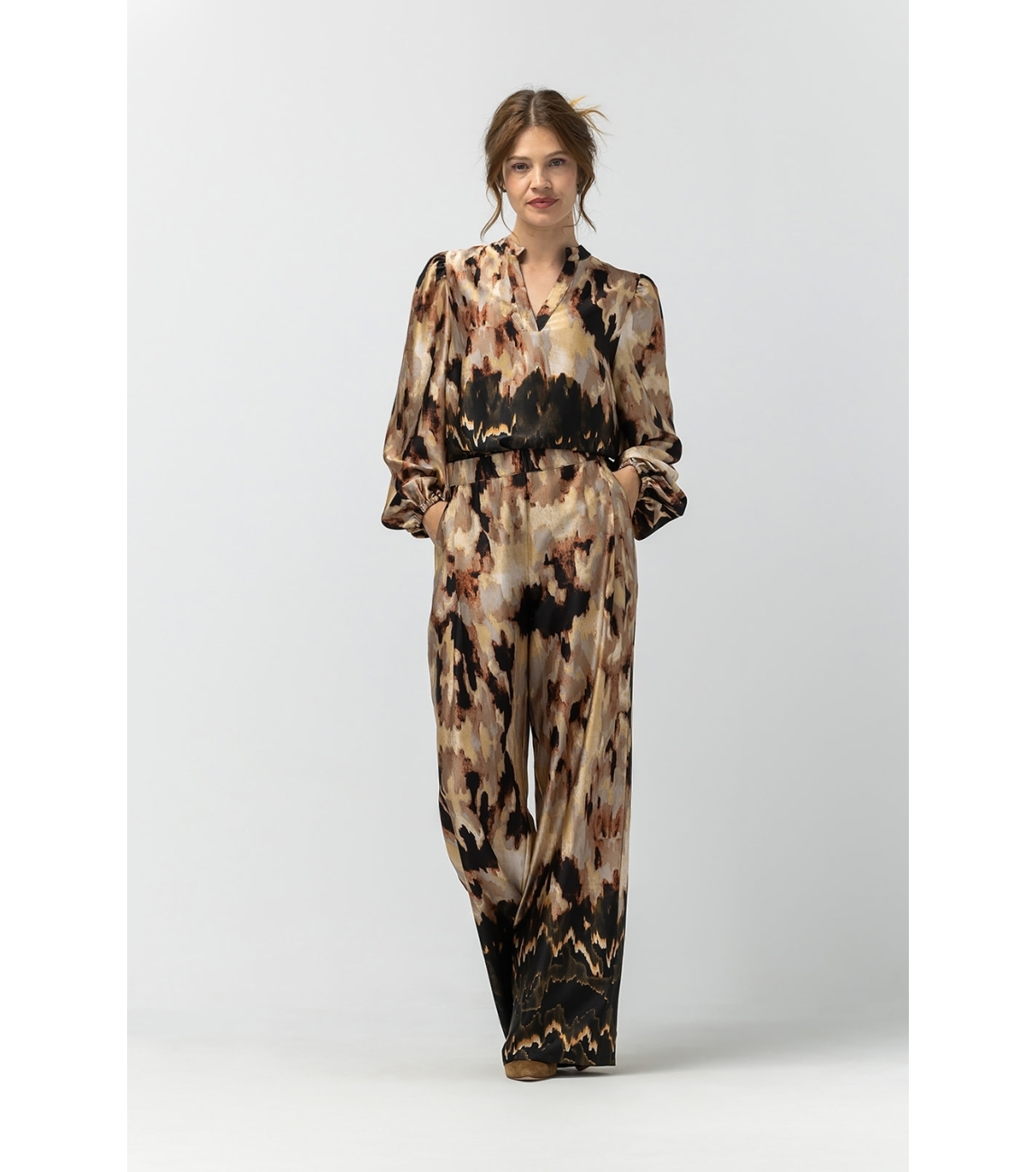 Label Dot broek Reva 2528003. Dit wide leg model sluit door middel van een elastische boord en beschikt over twee steek- en paspelzakken. Deze multi colour broek van Label Dot beschikt over plooidetails aan de bovenzijde en is all-over glanzend uitgevoerd.