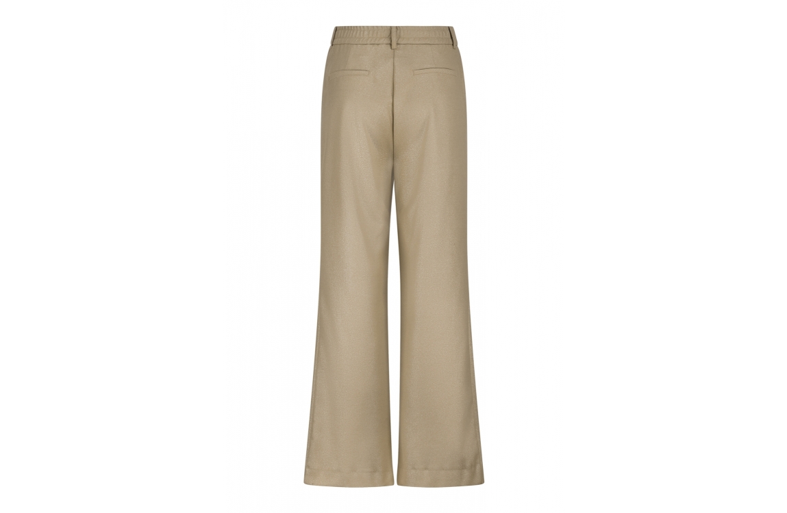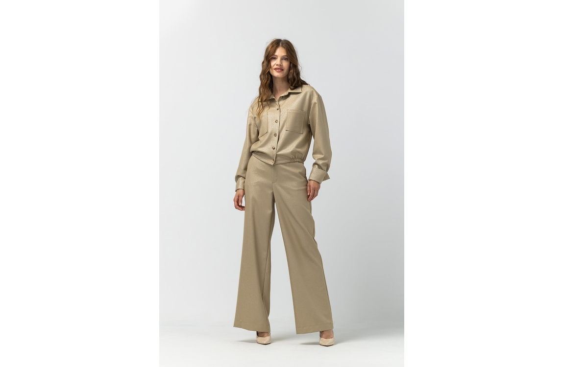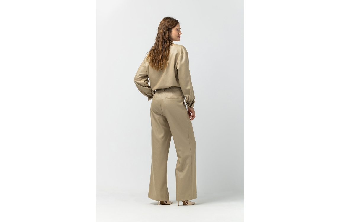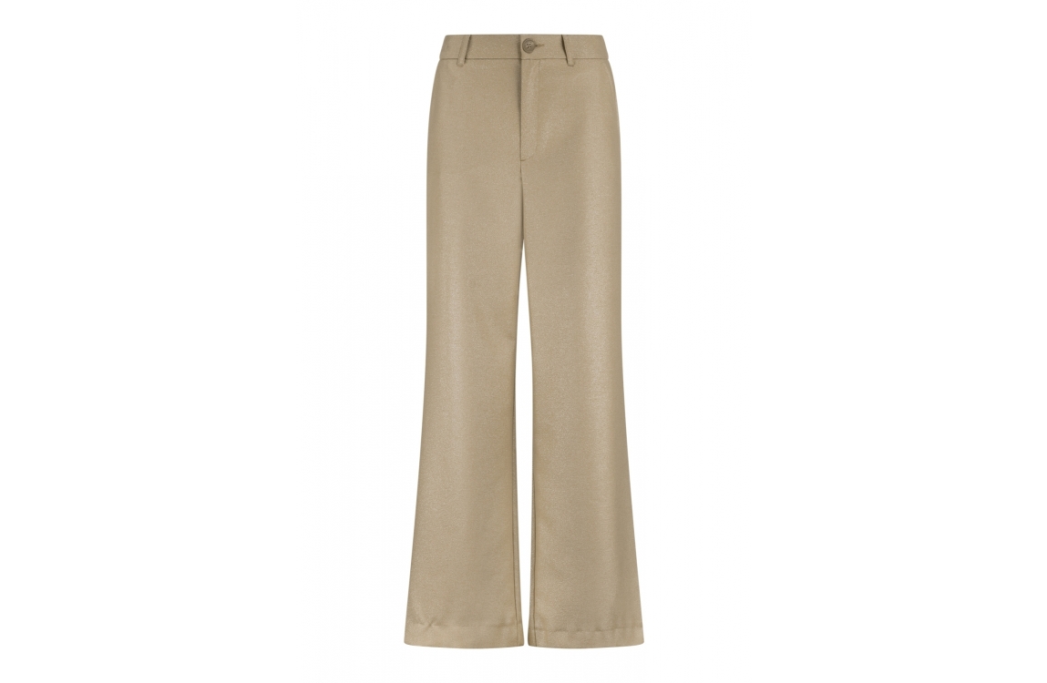 Label Dot pantalon Rian 2528022. Dit wide leg model sluit door middel van een knoop en rits afgewerkt met ceintuurlussen. Deze goud kleurige pantalon van Label Dot is voorzien van twee steekzakken aan de voorzijde en twee fake paspelzakken aan de achterzijde. Dit model is bewerkt met glitter.