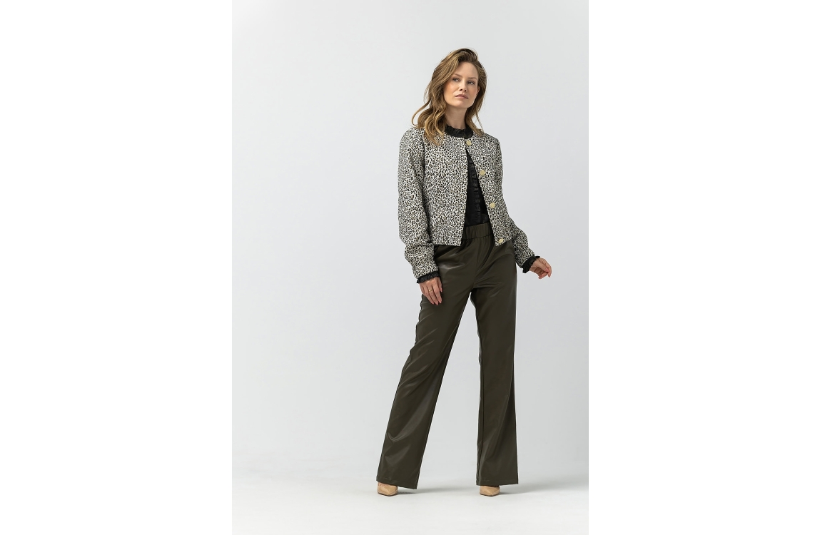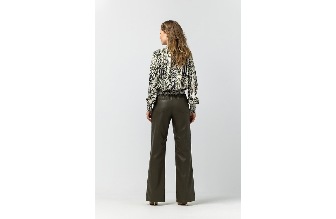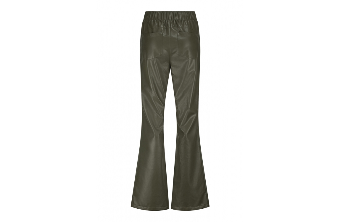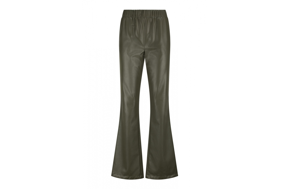 Label Dot broek Rina 2528007. Dit wide leg model sluit door middel van een elastische boord en beschikt over twee steekzakken aan de voor- en achterzijde. Deze khaki kleurige broek van Label Dot is uitgevoerd in een fake leather kwaliteit.