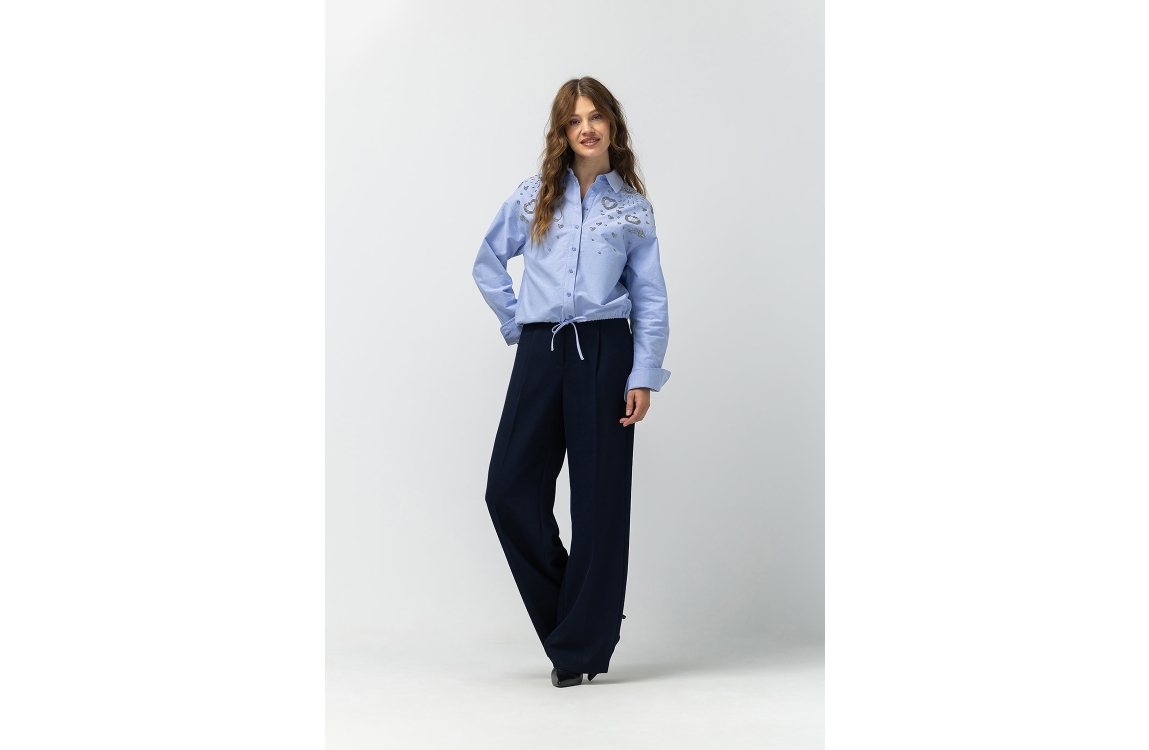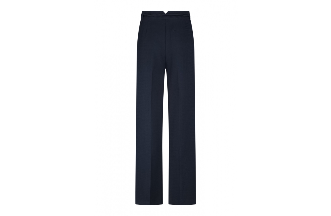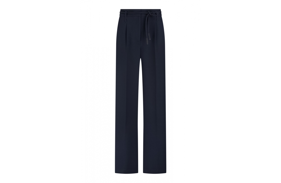 Label Dot broek Rosan 2528015. Dit straight fit model sluit door middel van een knoop- en ritssluiting. Deze donkerblauwe broek van Label Dot is voorzien van een trekkoord en plooidetails. Het model beschikt over twee steekzakken aan de voorzijde en een paspelzak aan de achterzijde.