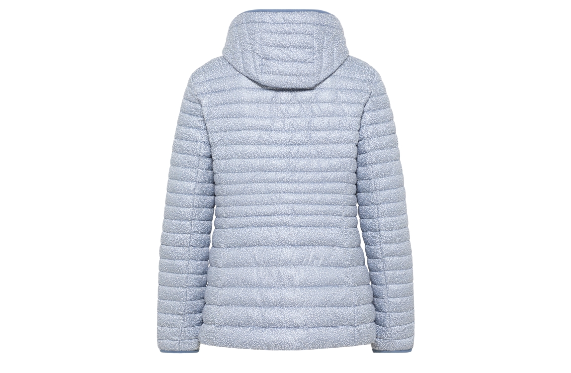 Lebek jas 50610042. Dit rechtvallende model heeft een (afneembare) capuchon, lange mouwen en sluit door middel van een rits. Deze blauwe jas van Lebek is voorzien van een all over grafiche print en uitgevoerd in een gewatteerd materiaal.Deze jas beschikt over twee ritszakken op het voorpand en een subtiel merkembleem op de mouw.