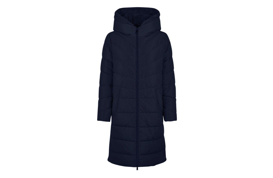 Lebek Mantel mit Webpelz 850 Navy. Dit rechtvallende model heeft een capuchon, lange mouwen en sluit door middel van een rits. Deze donkerblauwe winterjas van Lebek beschikt over twee steekzakken aan de voorzijde.