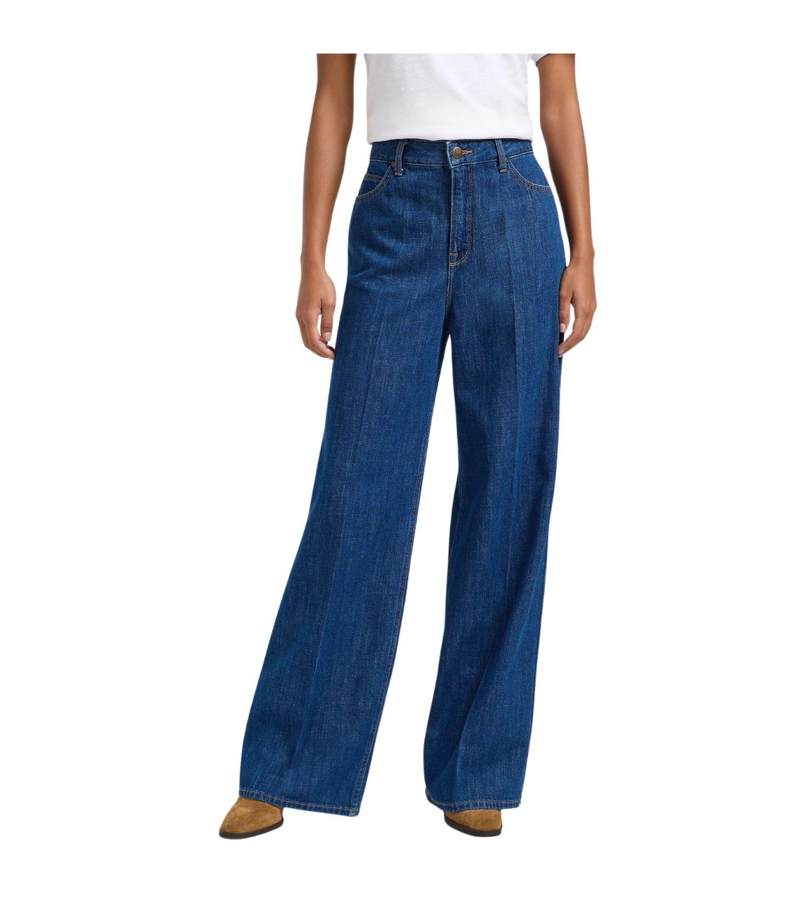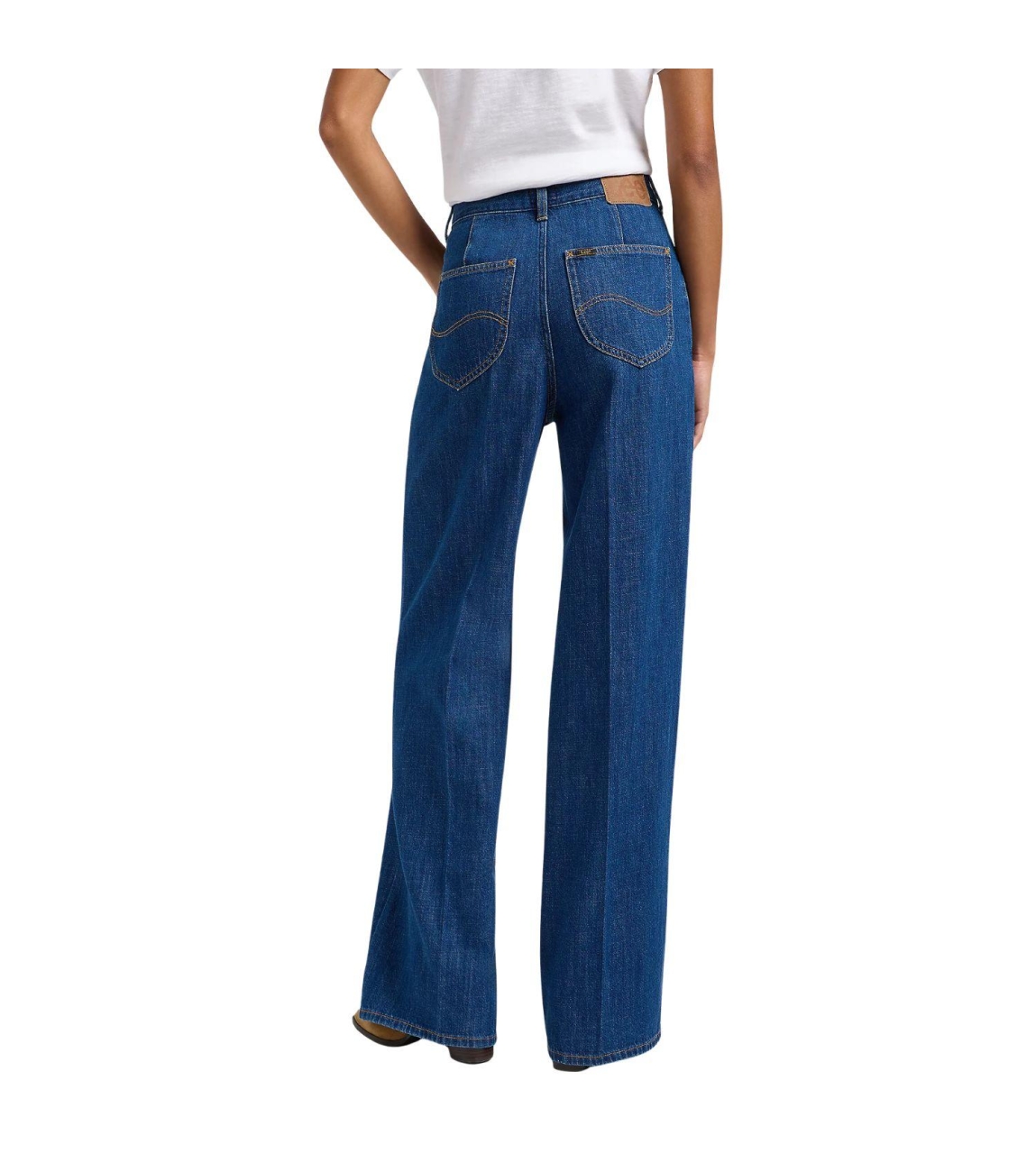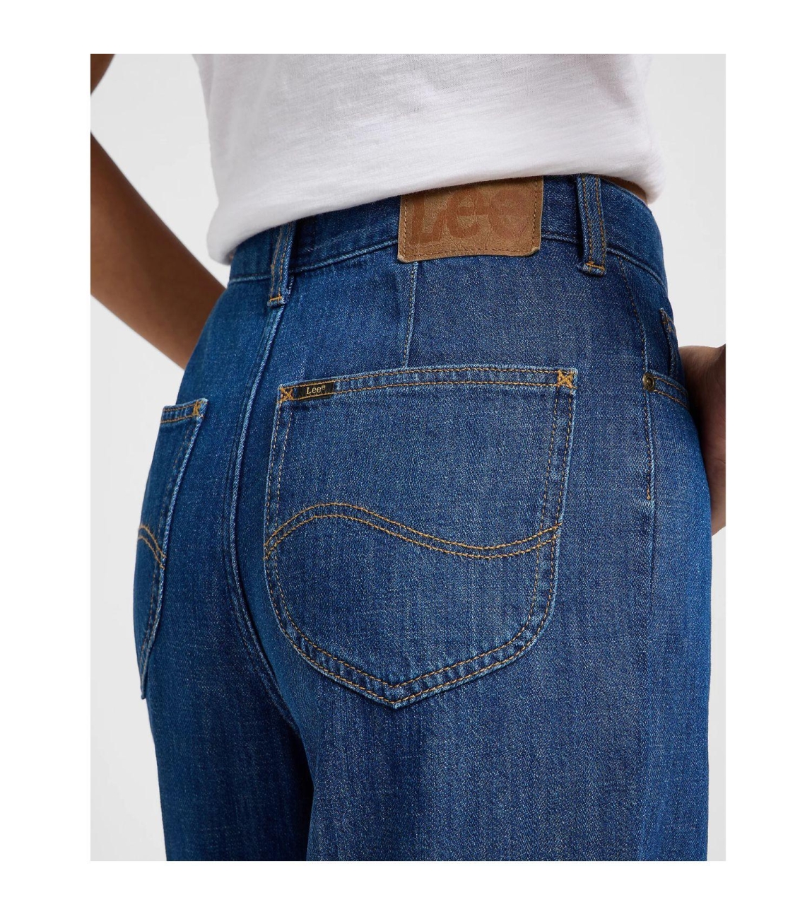 Lee Stella dark eton Dark eton. Dit wide leg model sluit door middel van een knoop- en ritssluiting en is voorzien van ceintuurlussen. Deze denim broek van Lee beschikt over twee steekzakken met een muntenzakje aan de voorzijde en twee steekzakken aan de achterzijde. Het model is uitgevoerd in een opvallende donkerblauwe wassing met subtiele fading.