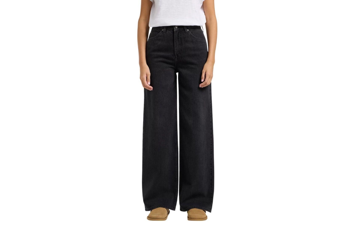 Lee jeans Stella 1123563522. Dit wide high waist fit sluit door middel van een knoop en rits afgewerkt met ceintuurlussen. Deze zwarte jeans van Lee is uitgevoerd in een 5-pocket model.