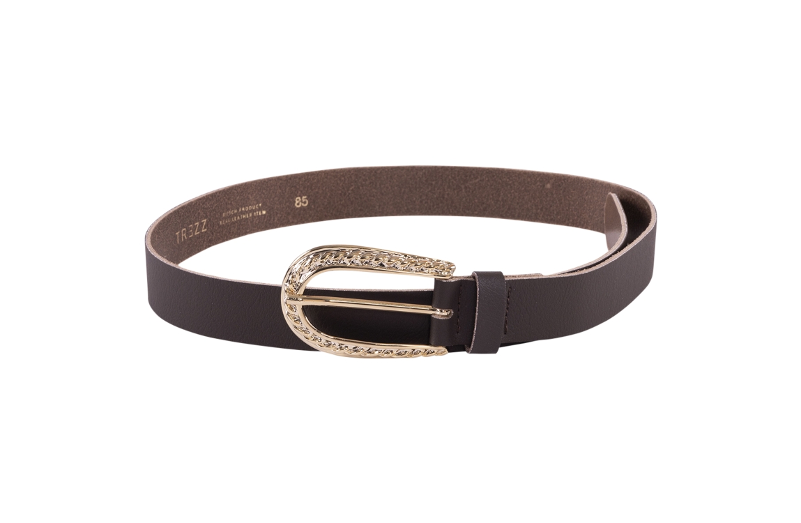 Leekan Trezz ceintuur. Deze donkerbruine riem sluit door middel van goudkleurig gesp, is verstelbaar en is uitgevoerd in echt leer. Dit model is afkomstig uit Nederland.
