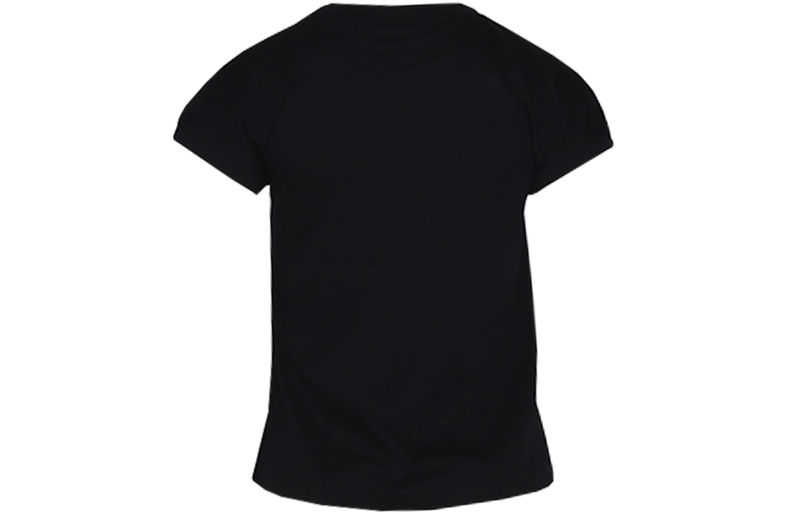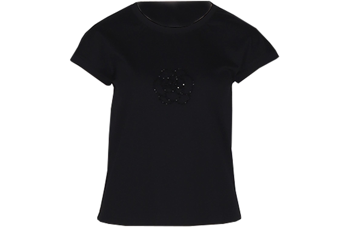 Leo & Ugo top TEK887. Dit rechtvallend model heeft een ronde hals en korte mouwen. Deze zwarte top van Leo & Ugo is voorzien van een ton-sur-ton glitter bloem op het voorpand.