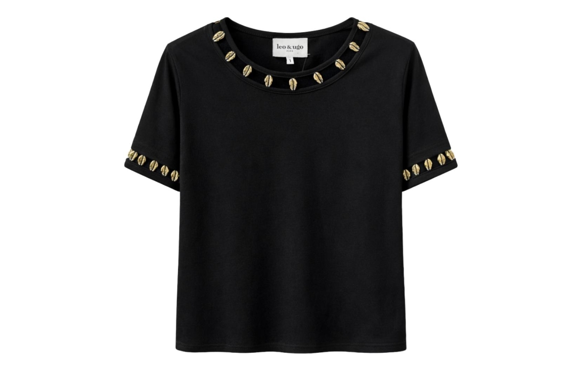 Leo en Ugo Top TEB749. Dit rechtvallend model heeft een ronde hals en korte mouwen. Dit zwarte T-shirt van Leo & Ugo is bewerkt met gouden schelpen rond de halslijn en aan de onderzijde van de mouwen.