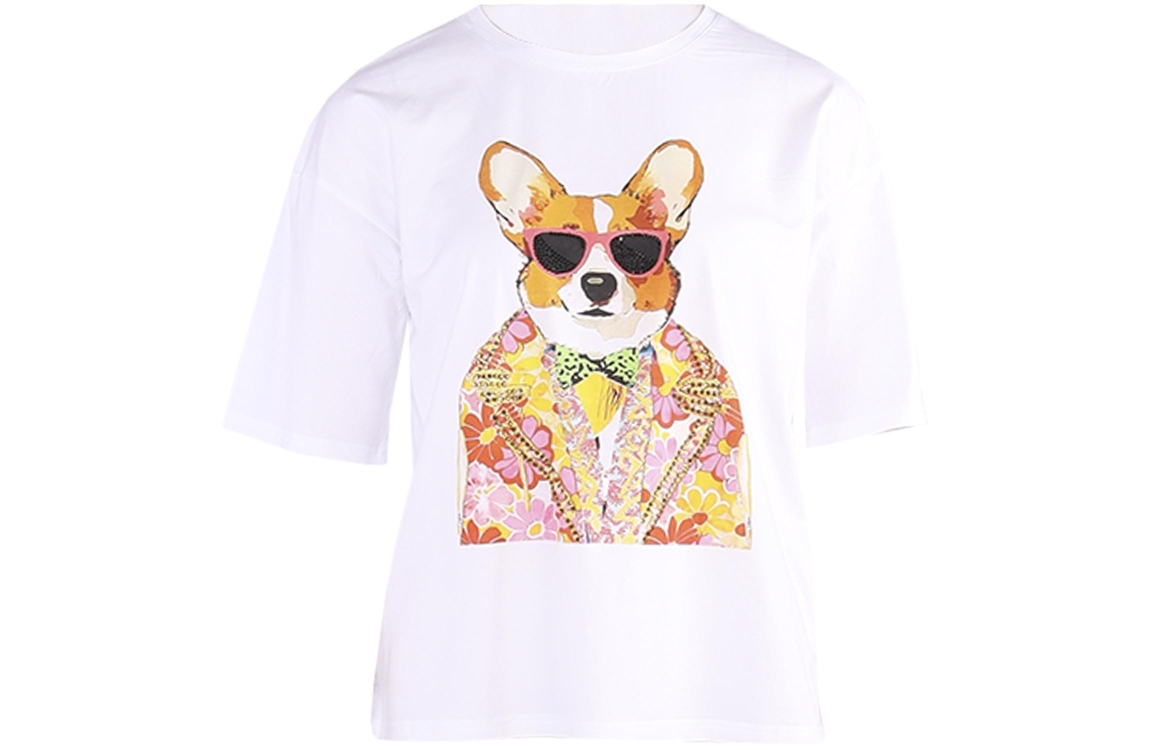 Leo en Ugo T-shirt L61-TEK079. Dit rechtvallende model heeft een ronde halslijn en korte mouwen. Deze witte T-shirt van Leo & Ugo is op het voorpand voorzien van een hondenprint, afgewerkt met strass-steentjes in verschillende kleuren. Het model is uitgevoerd in stretchkwaliteit.
