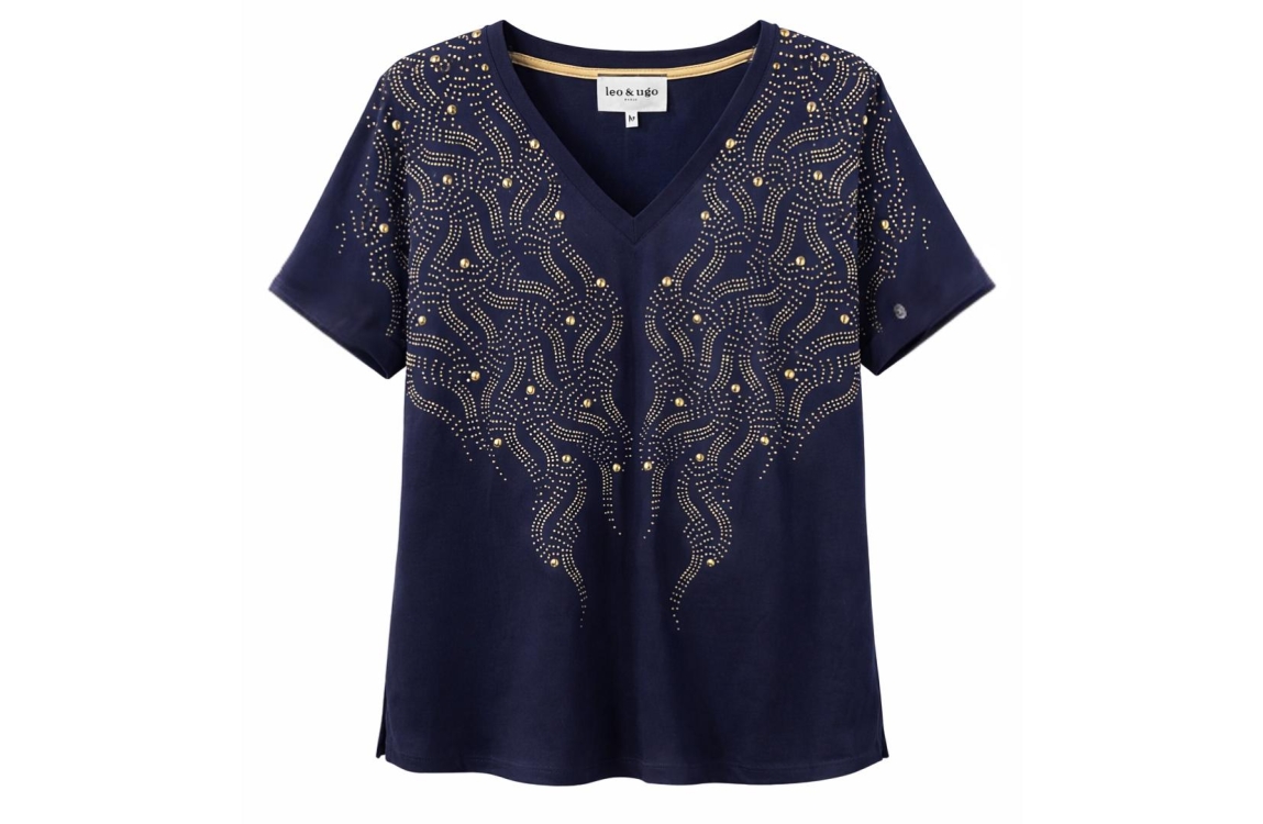 Leo en Ugo top TEV655. Dit soepelvallend model heeft een v-hals en korte mouwen. Deze donkerblauwe top van Leo & Ugo is bewerkt met gouden studs op het voorpand.