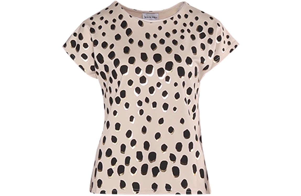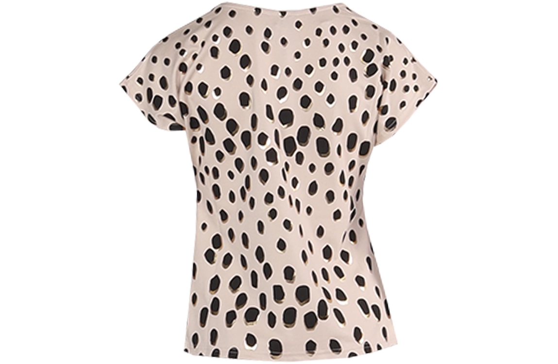 Leo en Ugo top L61-TEV659. Dit rechtvallende model heeft een ronde halslijn en korte mouwen. Deze beige top van Leo en Ugo is all-over bewerkt met een zwarte/goudkleurige stippatroon en is uitgevoerd in stretchkwaliteit.