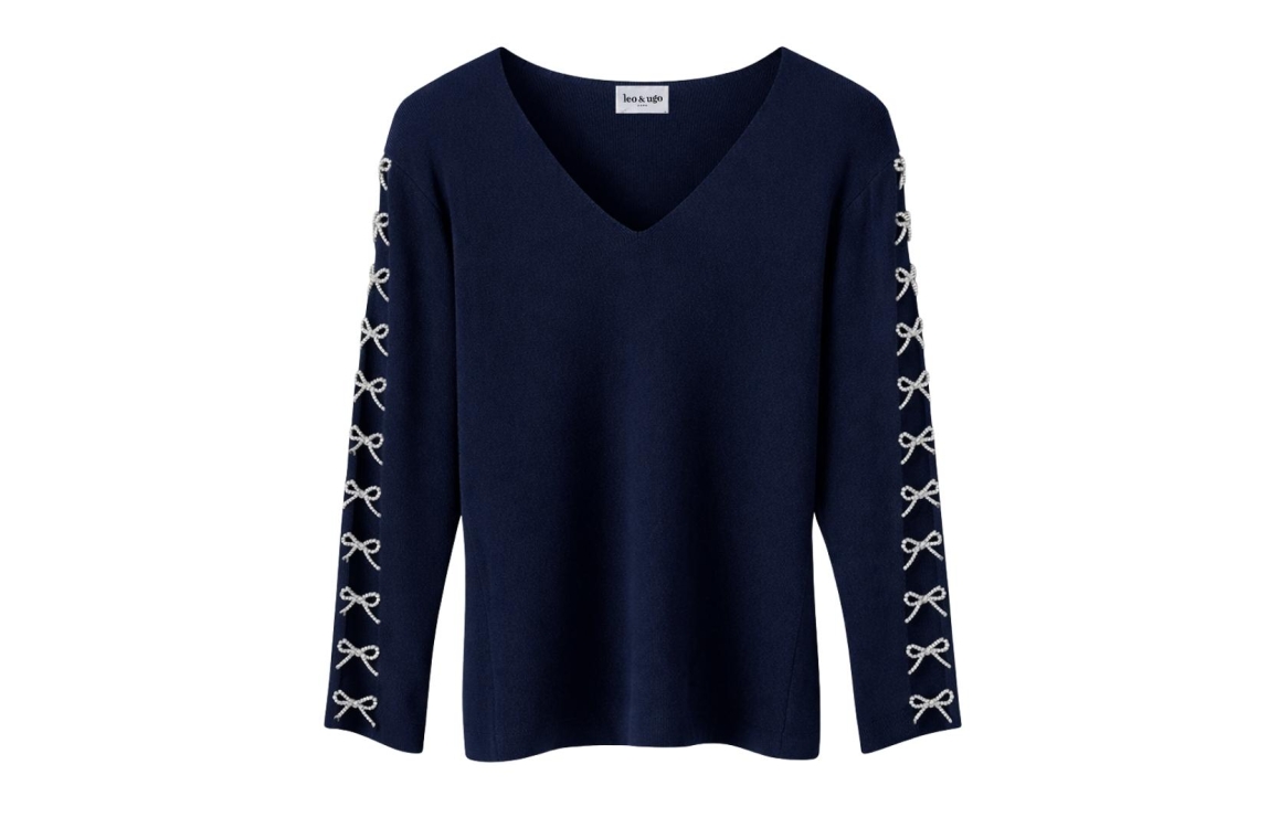 Leo en Ugo TOP AE118. Dit aangesloten model heeft een v-hals en lange mouwen. Deze donkerblauwe top van Leo & Ugo is voorzien van opengewerkte mouwen met daartussen zilveren strikjes.