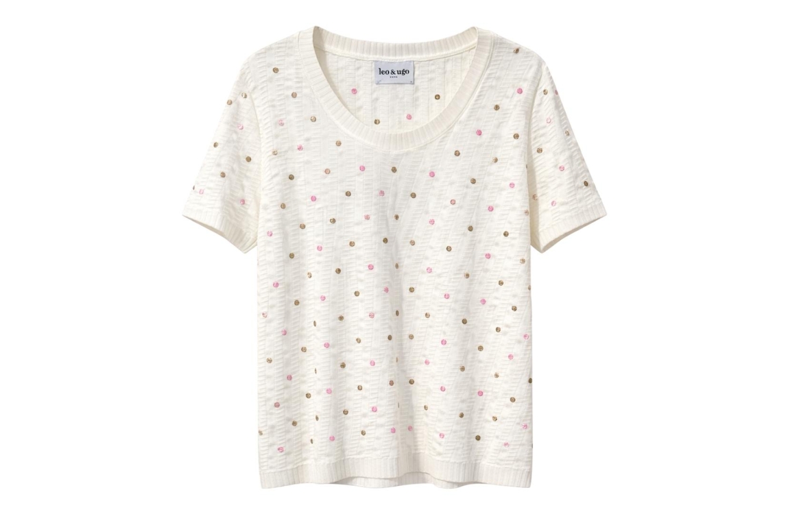 Leo en Ugo TOP AE127. Dit rechtvallend model heeft een ronde hals en korte mouwen. Deze witte top van Leo & Ugo is uitgevoerd in een gebreid materiaal en bewerkt met goud en roze polkadots.