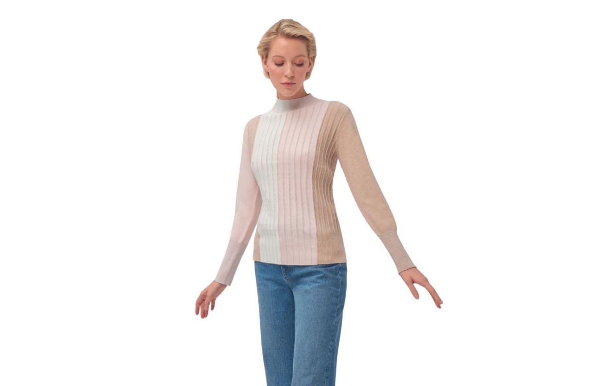 Leo en Ugo top AW440. Dit rechtvallend model heeft een turtleneck en lange mouwen. Deze beige top van Leo en Ugo is all-over bewerkt met een streepprint in het roze en wit en heeft glitter details. De boorden zijn afgewerkt in een gebreide ribstof.