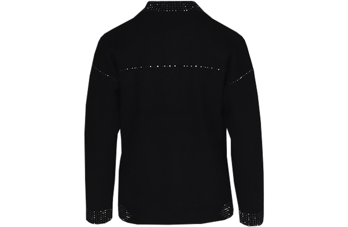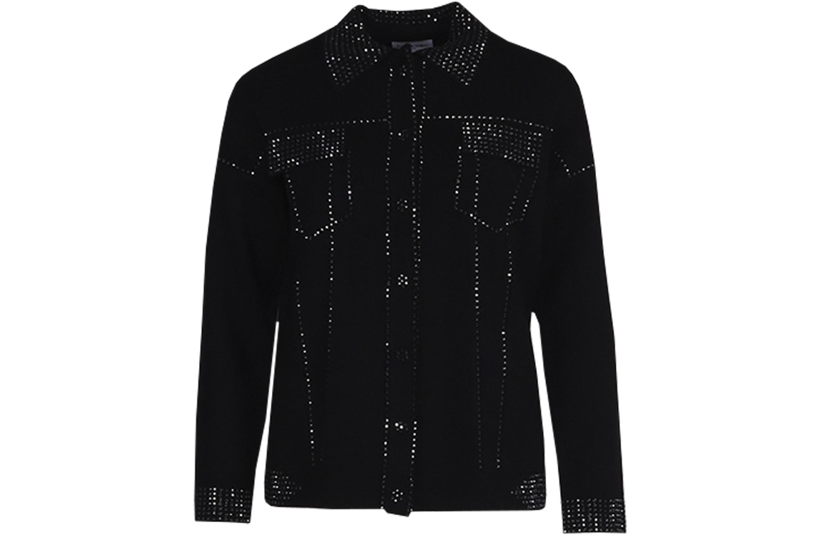 Leo & Ugo vest AW463. Dit rechtvallend model heeft een kraag en lange mouwen. Deze zwarte vest van Leo & Ugo sluit aan de voorzijde door middel van knopen en is all-over bewerkt met zwarte strass-steentjes.