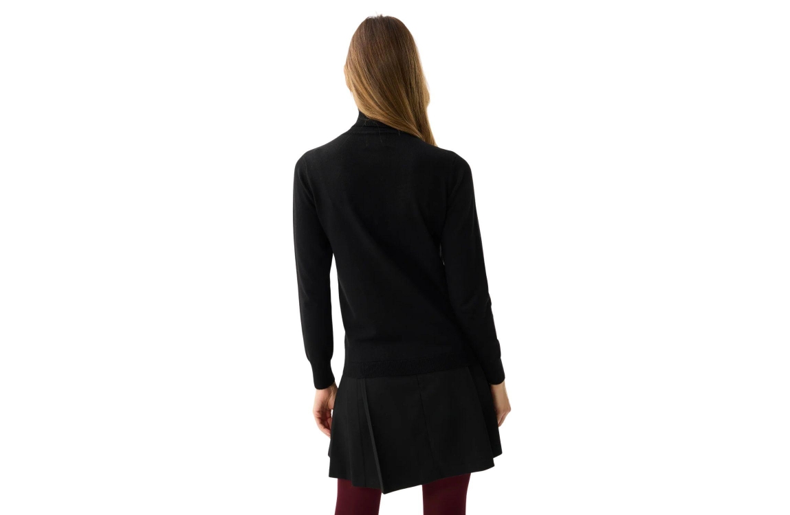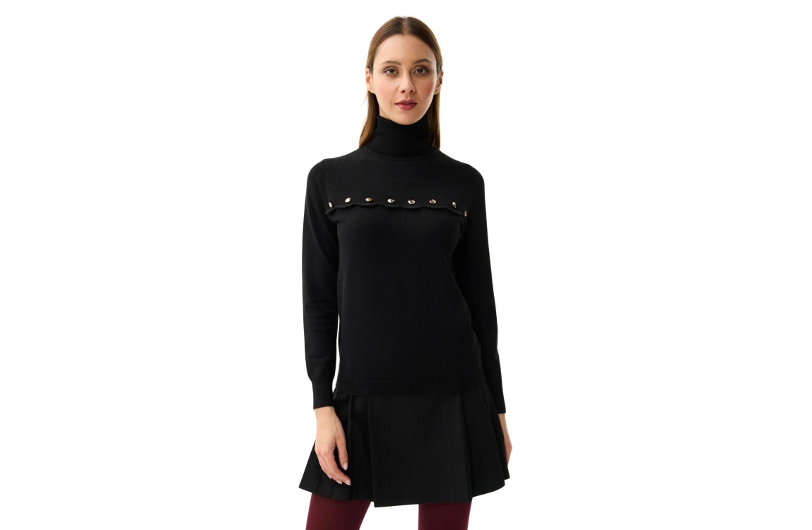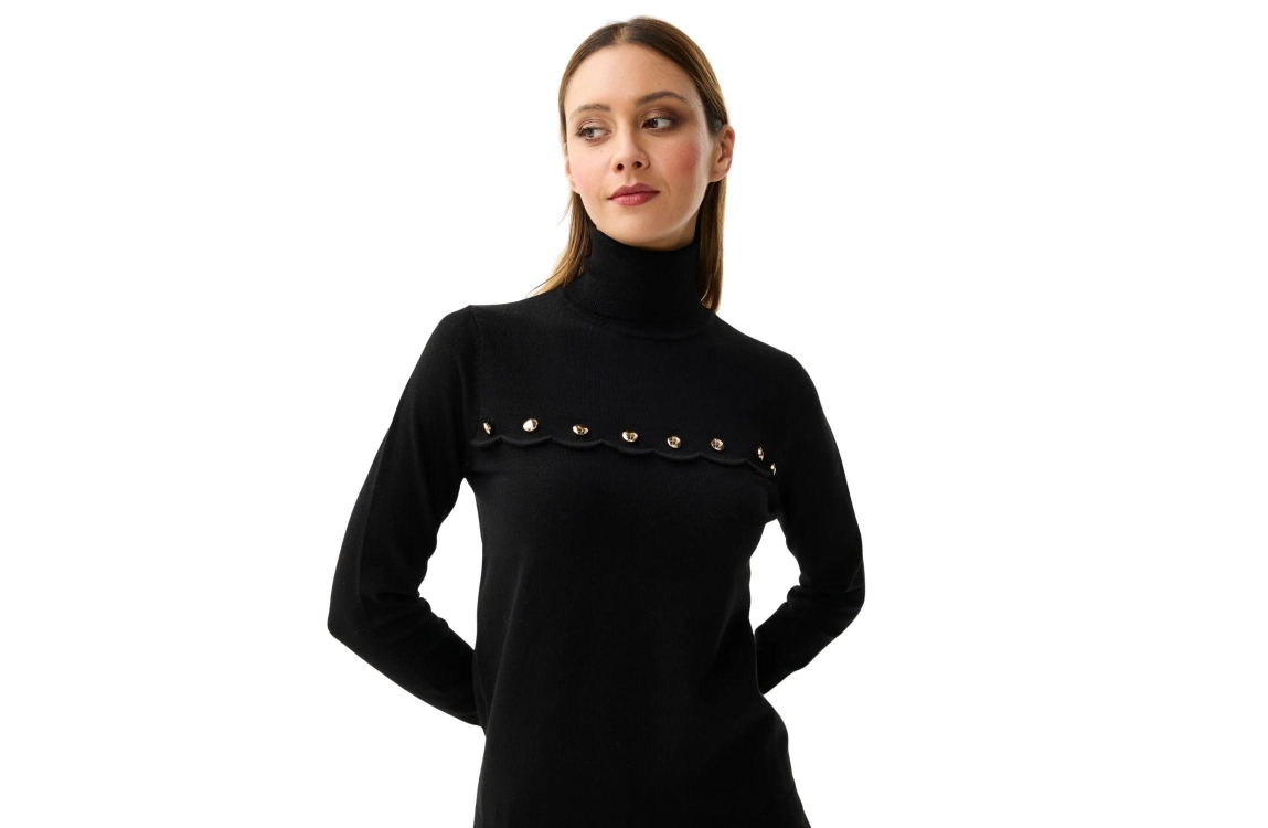 Leo en Ugo Top Black. Dit rechtvallende model heeft een col, lange mouwen en is afgewerkt met elastische boorden aan de onderzijde. Deze zwarte top van Leo en Ugo is aan de voorzijde bewerkt met een golvende bies met decoratieve goudkleurige knopen.