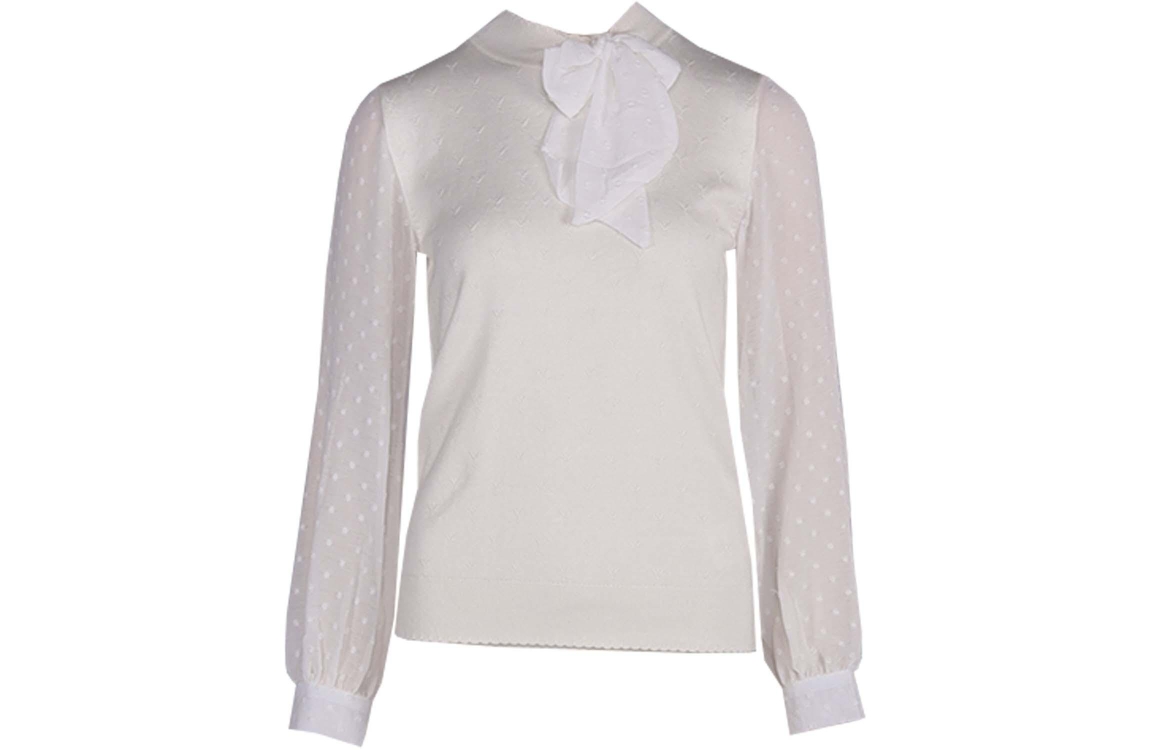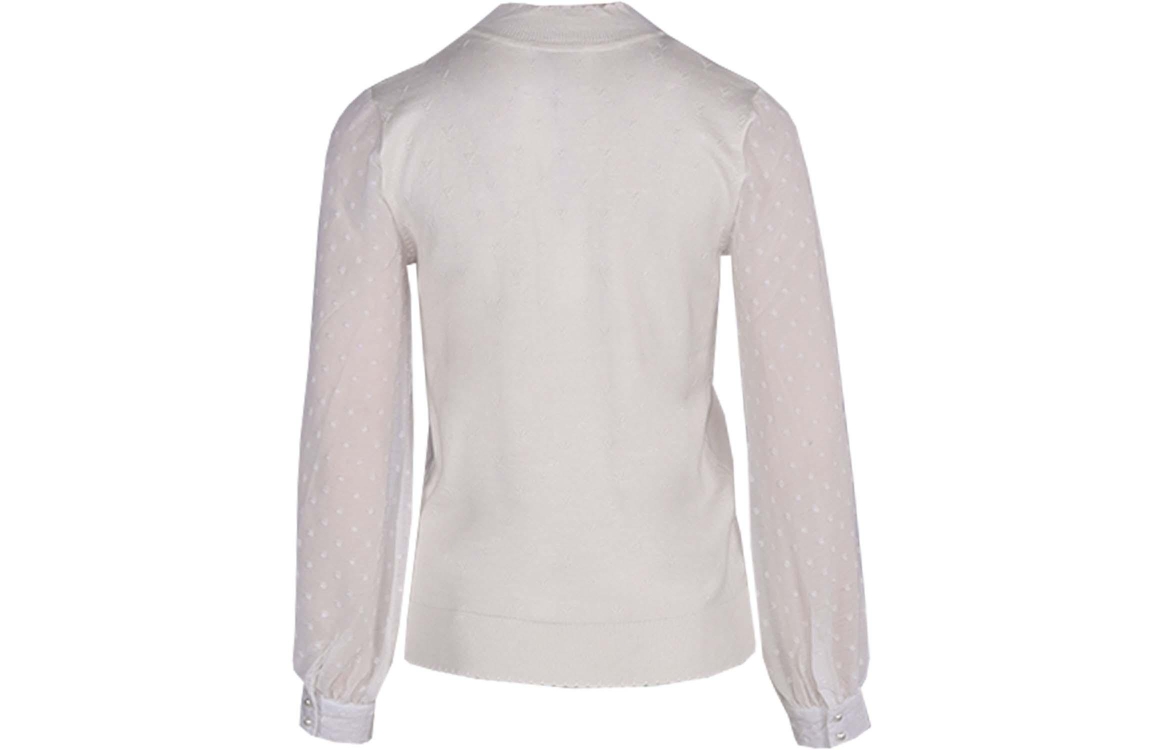 Leo & Ugo top BW506-4. Dit rechtvallend model heeft een turtleneck en lange mouwen. Deze off-white top van Leo & Ugo heeft semi-transparante mouwen gedetailleerd met een stippatroon. Dit model is afgewerkt met scallop boorden en parelmoer knopen op de mouwboorden.