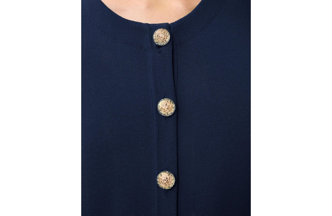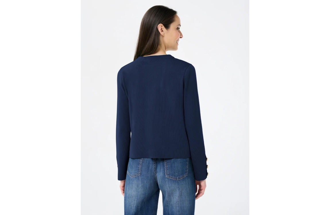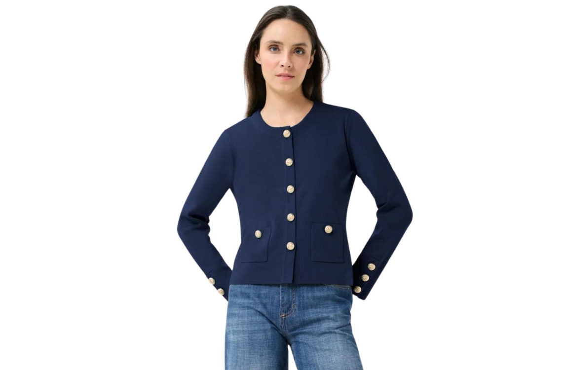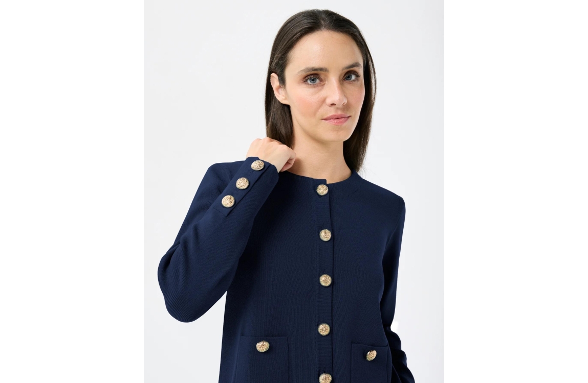 Leo & Ugo cardigan ae033. Dit rechtvallend model is voorzien van een ronde hals en heeft lange mouwen. Deze donkerblauwe cardigan van Leo & Ugo sluit door middel van goudkleurige sierlijke knopen.