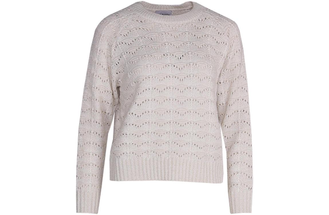 Leo en Ugo top NH164. Dit rechtvallend model heeft een ronde hals en lange mouwen. Deze gebroken witte trui van Leo en Ugo is opengehaakt uitgevoerd en is all-over gedetailleerd met glitter details. Dit model is afgewerkt met gebreide boorden.