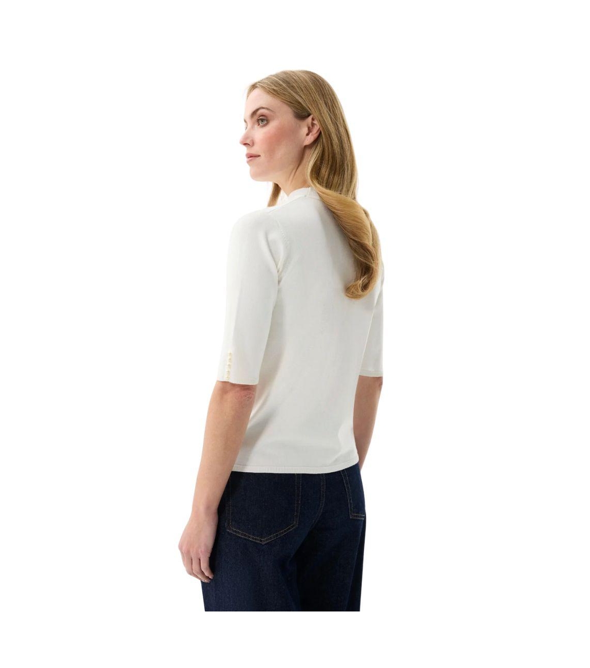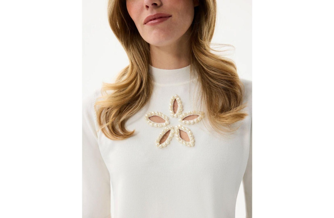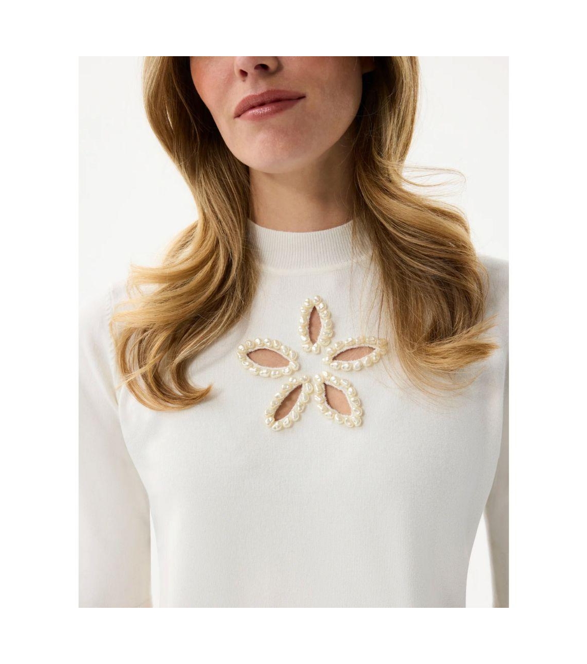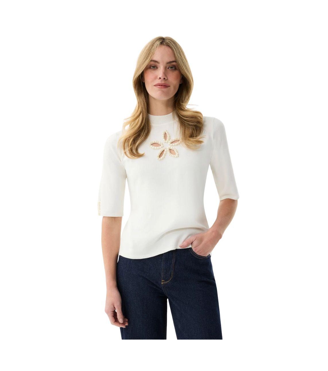Leo en Ugo Top AW121. Dit aangesloten model heeft een turtle hals en korte mouwen. Deze witte top van Leo & Ugo is bewerkt met een parelbloem op de borst. Dit model is op de mouwen bewerkt met parels.